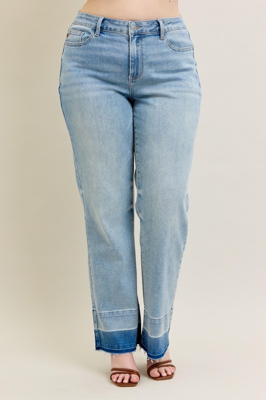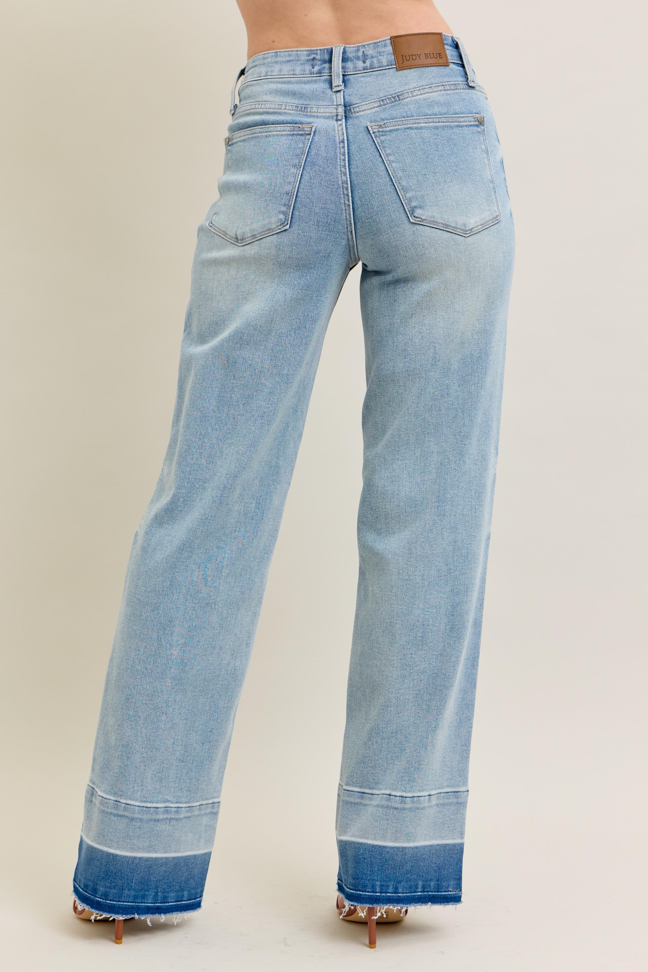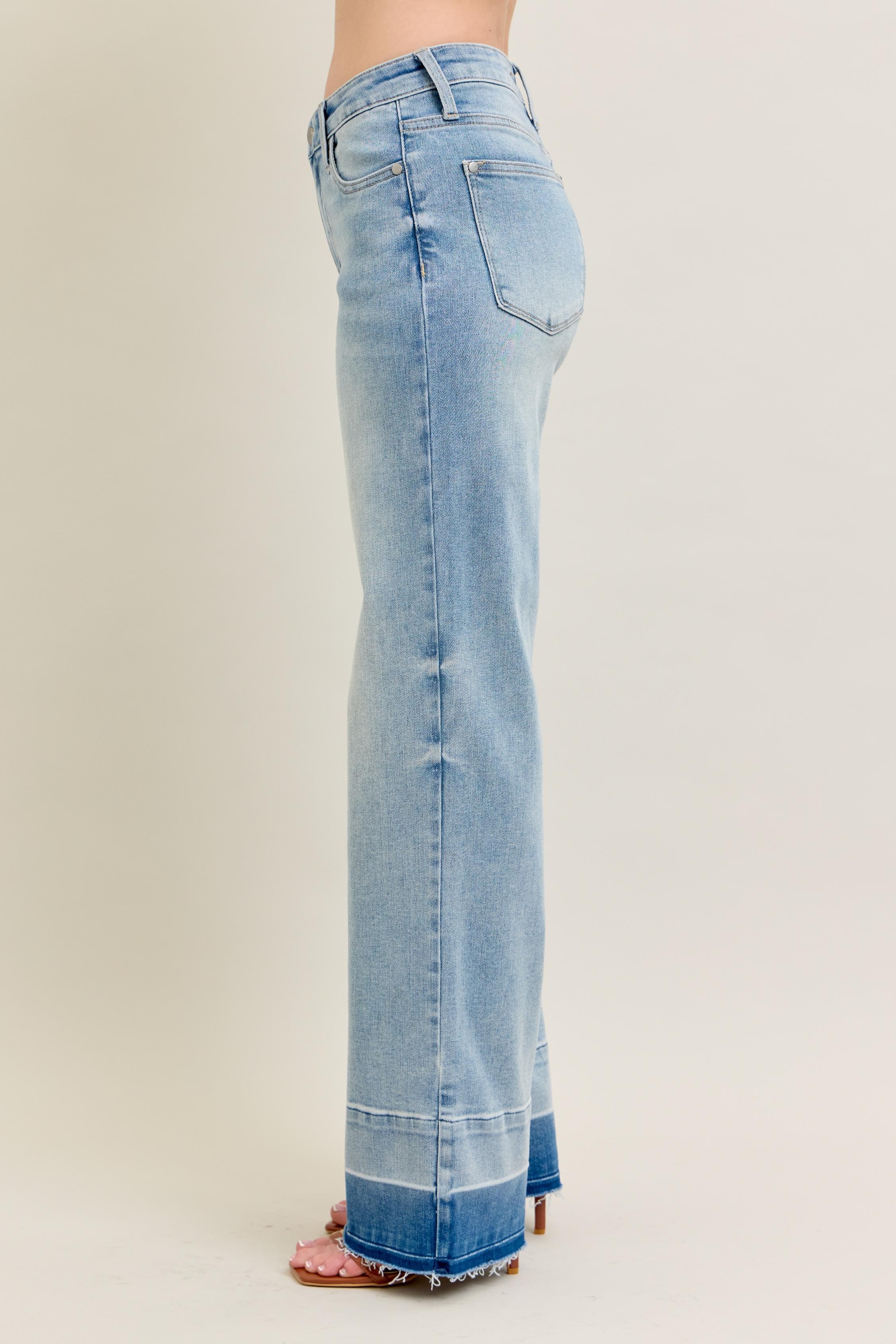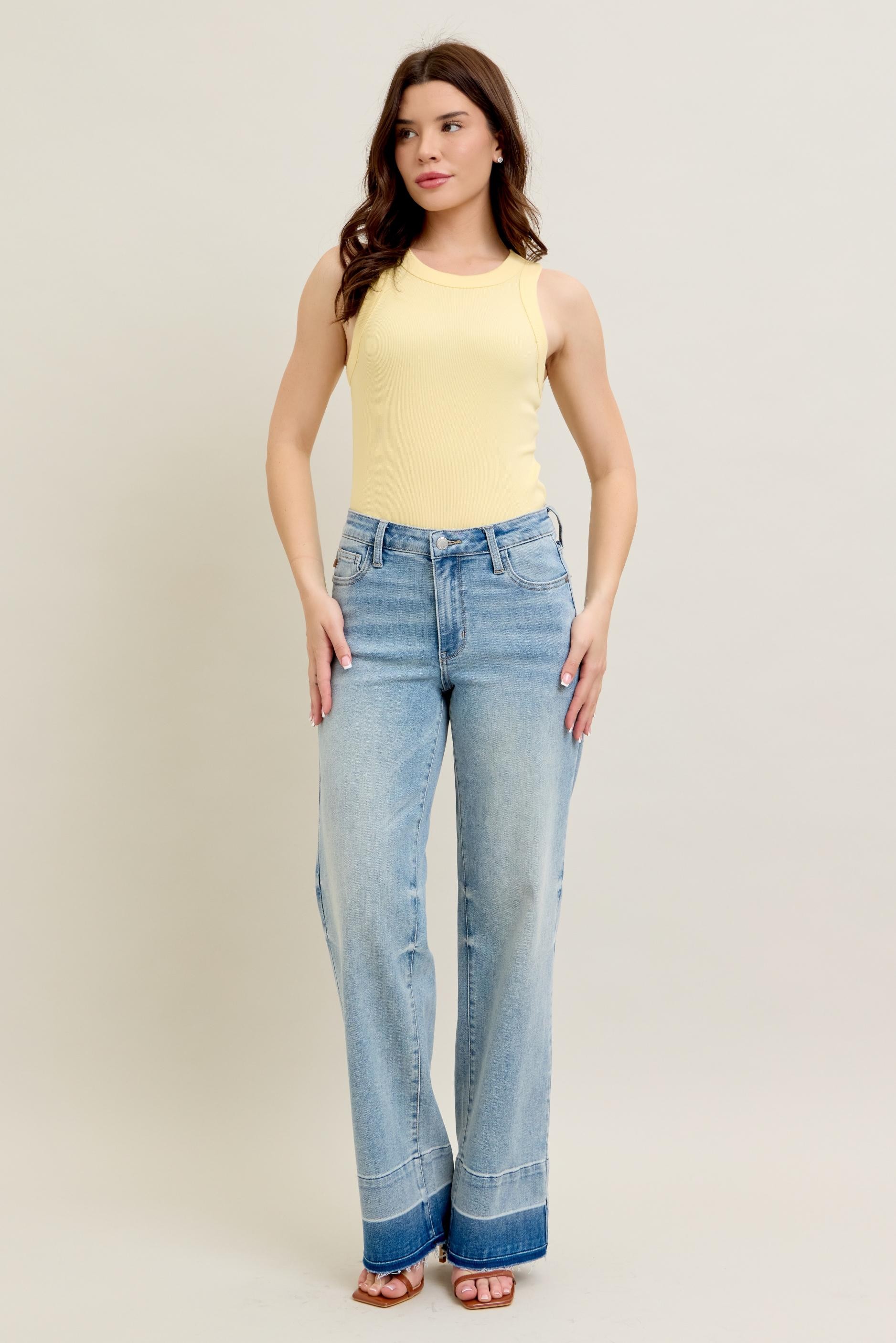 These contemporary wide-leg jeans feature a flattering high-rise silhouette crafted from premium stretch denim. The light wash finish offers versatile styling options while the distinctive released hem adds modern edge. The relaxed fit through hip and thigh creates a comfortable wearing experience. Made with quality denim fabric that provides excellent shape retention and durability. The contrast hem detail and raw edge finish create visual interest. Perfect for casual everyday wear with a fashion-forward twist.