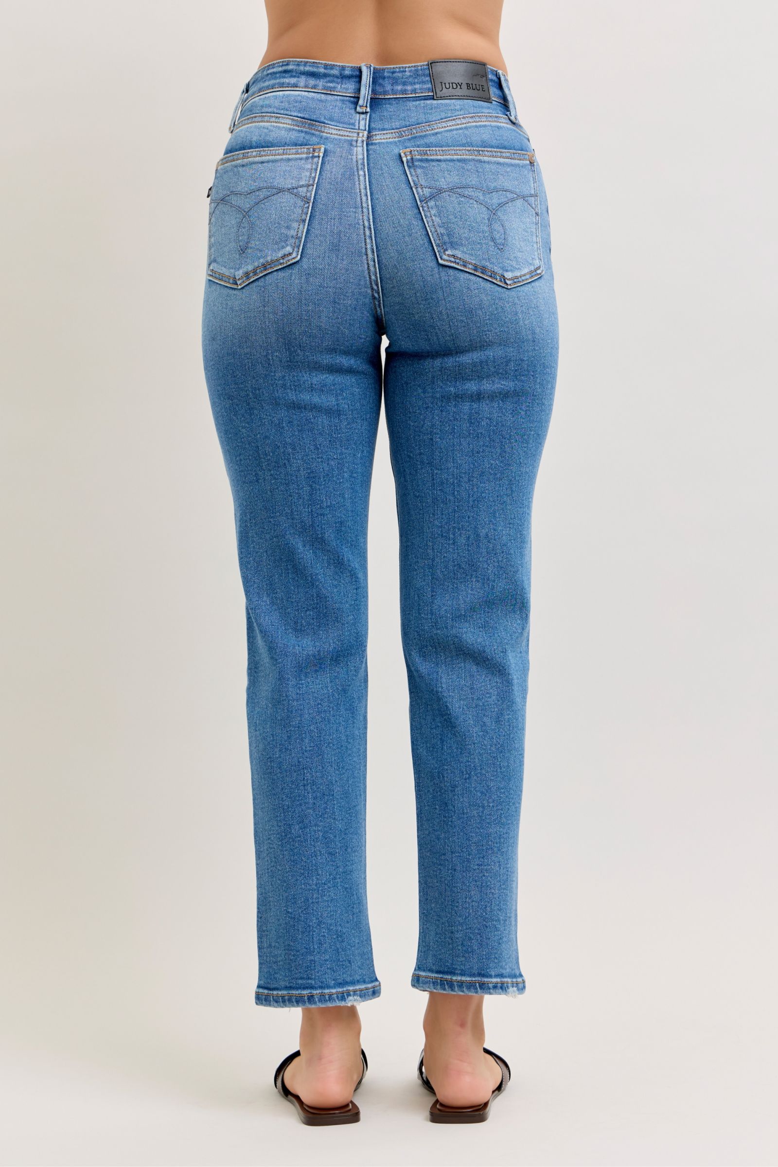These high-waisted straight-leg jeans offer a timeless and flattering silhouette. Crafted from durable denim, they provide both comfort and style. The classic wash and subtle seam detailing add a touch of sophistication, making them perfect for any occasion. The five-pocket styling and ankle-length cut enhance their practicality and versatility. These jeans are a wardrobe staple, easily paired with various tops and shoes for a chic and effortless look.