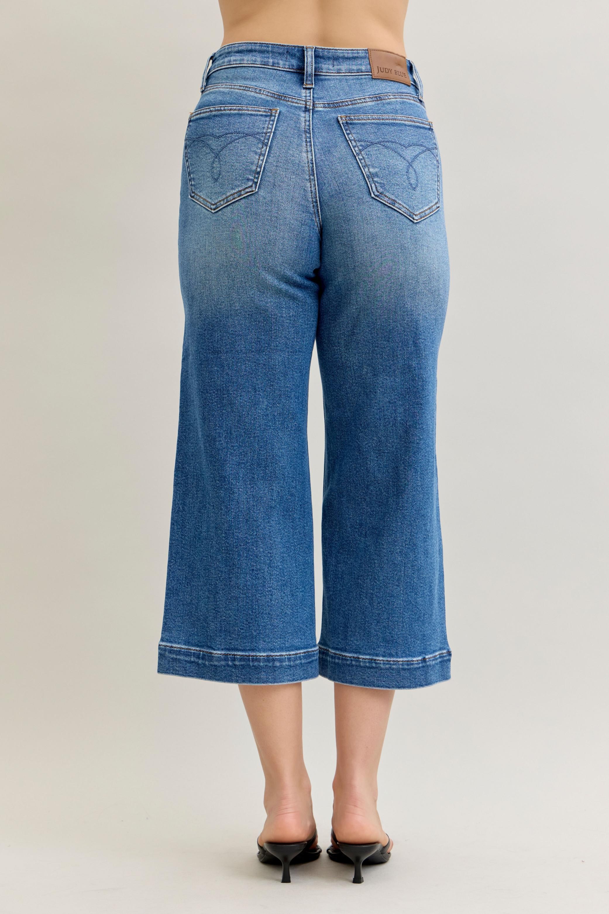 These mid-rise crop wide-leg jeans offer a trendy silhouette that is both flattering and fashion-forward. The mid-rise waist provides a comfortable fit that sits just right on the hips. The crop length adds a modern twist to the classic wide-leg style, perfect for showing off your favorite shoes. With a wide leg design, these jeans offer a relaxed and flowy feel for a stylish and casual look. Elevate your denim collection with these mid-rise crop wide-leg jeans that combine comfort and style effortlessly.