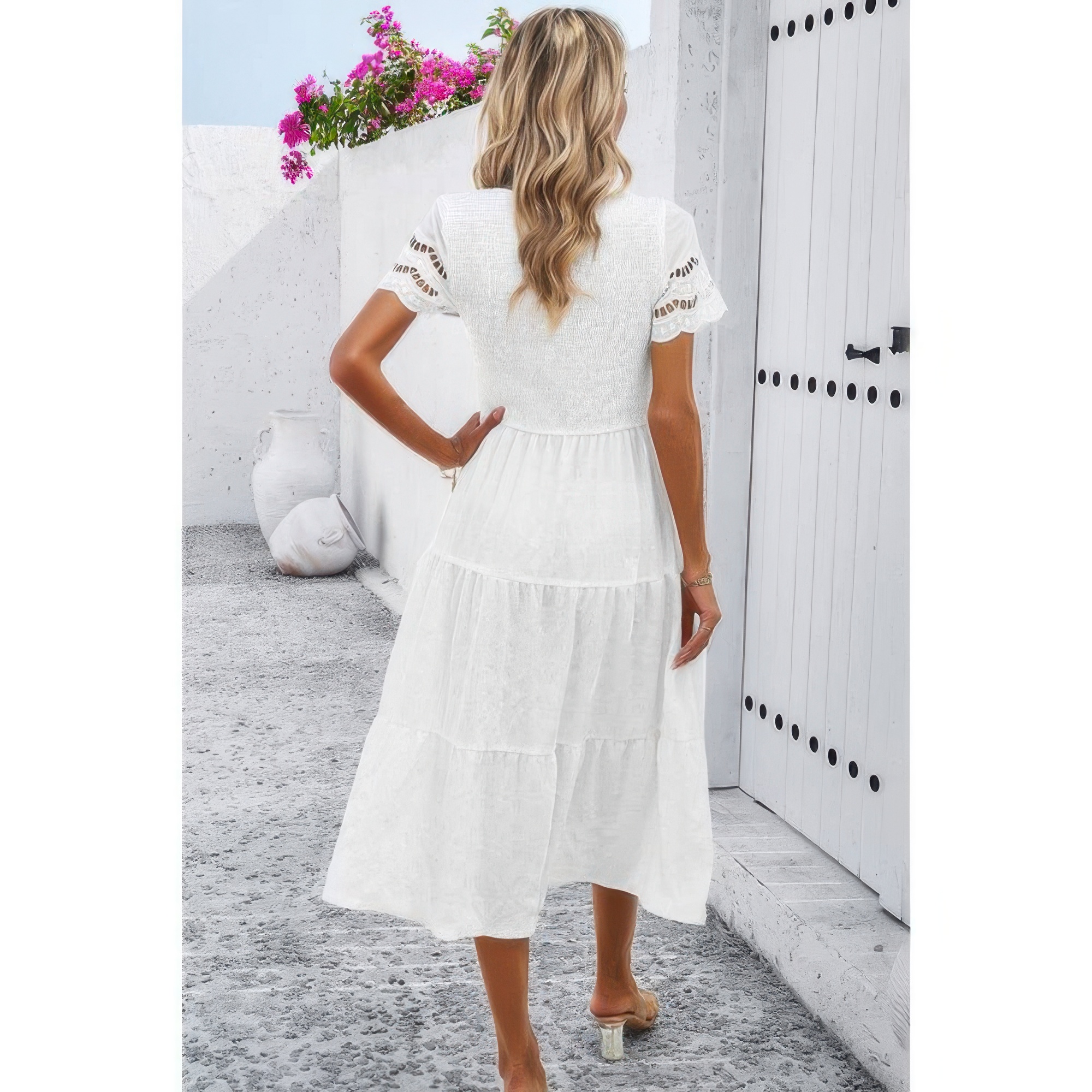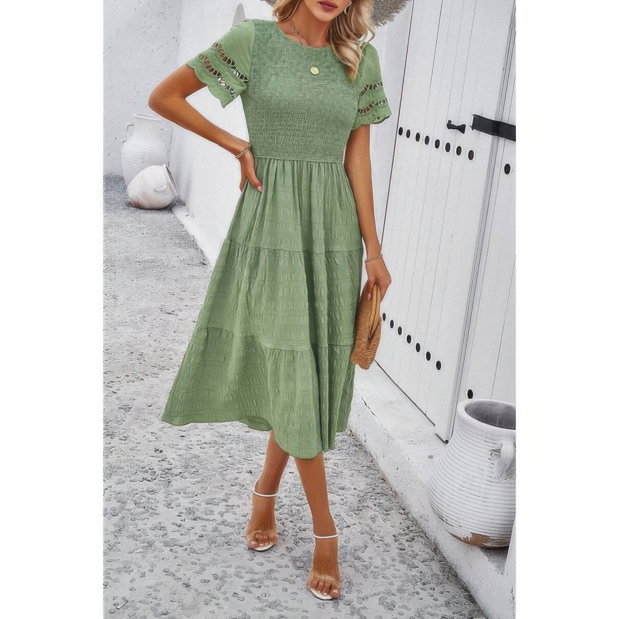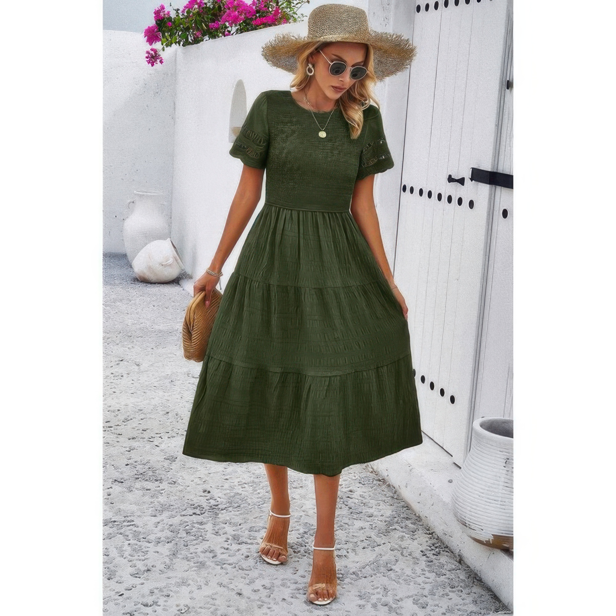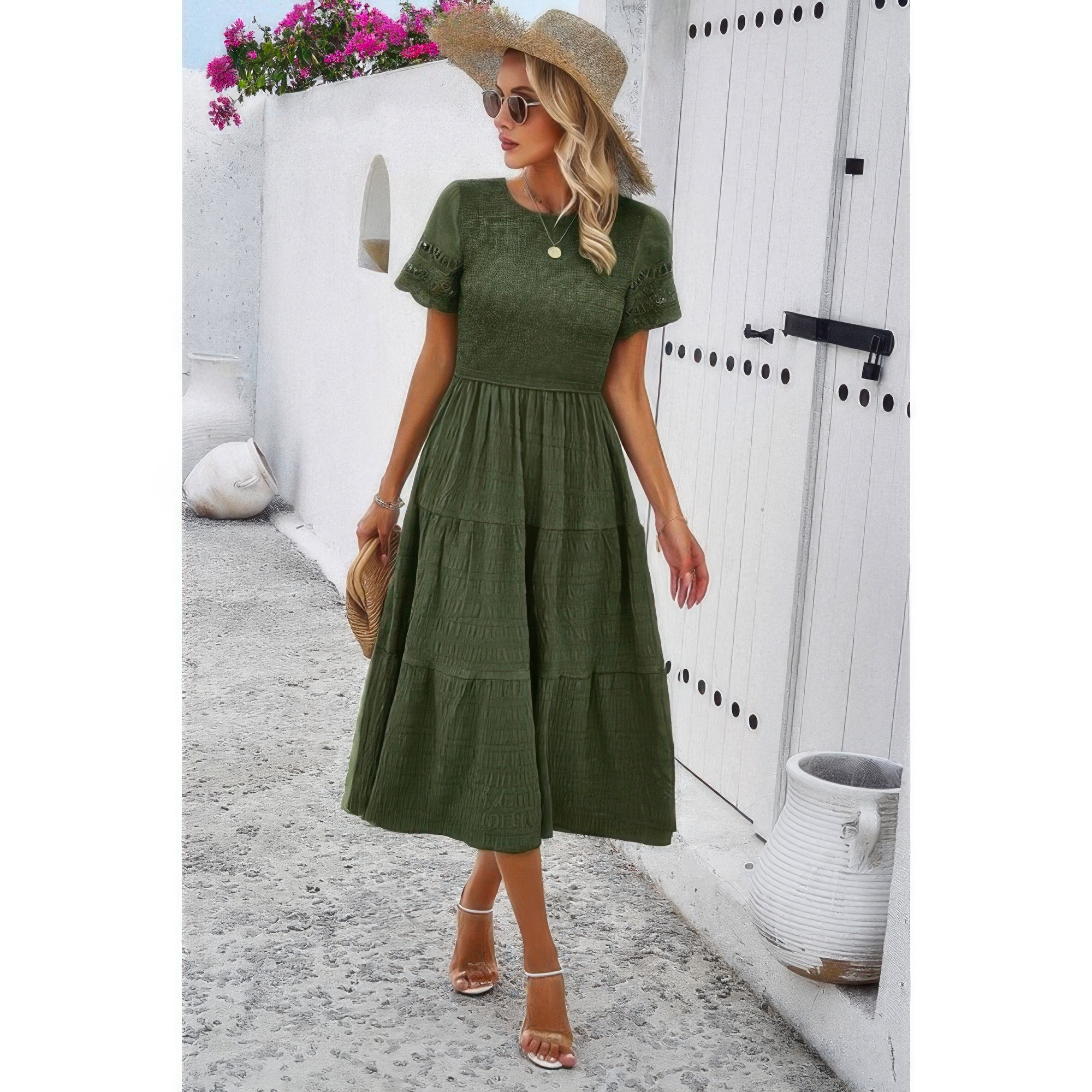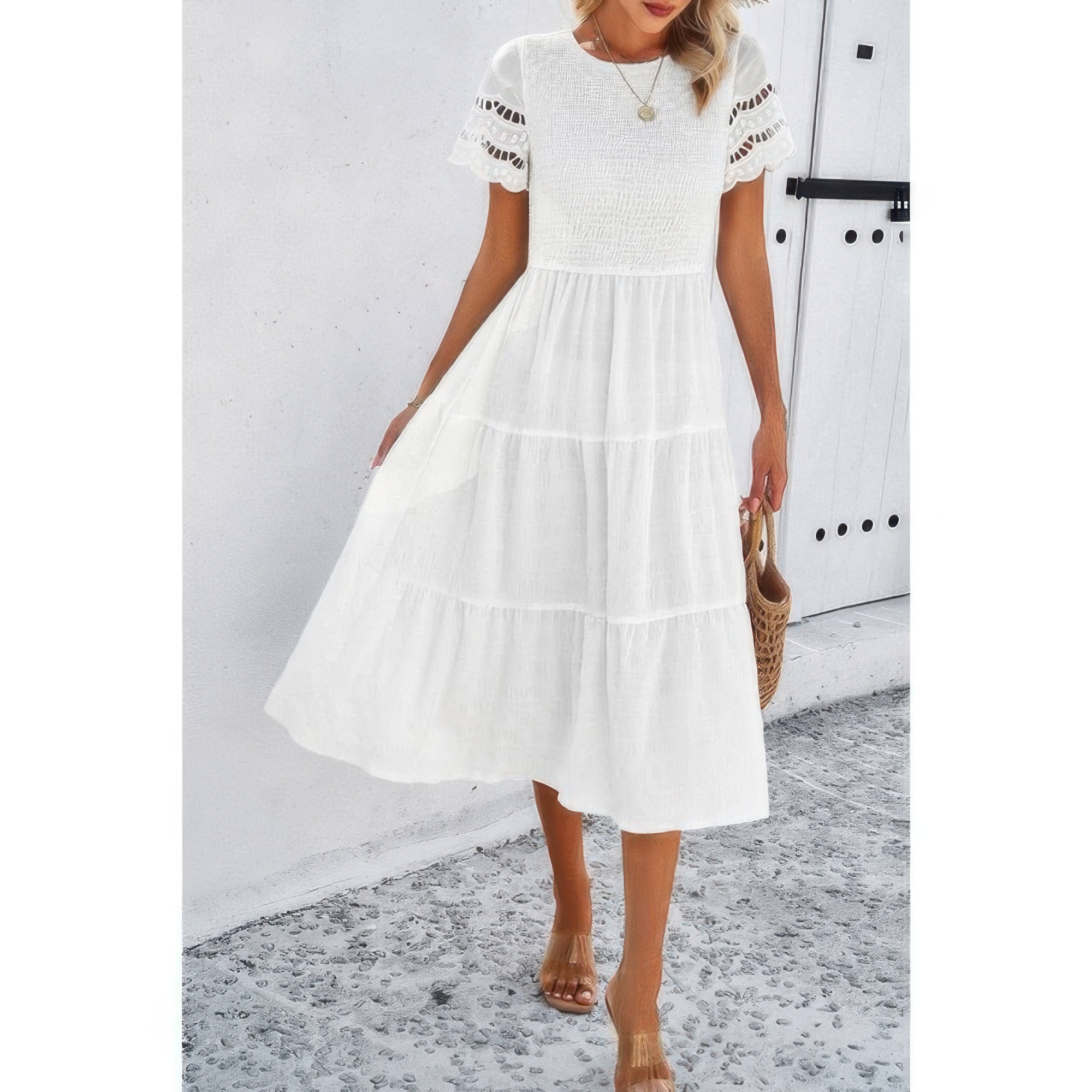 Feminine and flattering, this Lace Round Neck Ruched Fit Ruffle Solid Dress is designed to elevate your everyday style with subtle elegance. Featuring a delicate lace round neckline and soft ruching along the bodice, it contours your shape while maintaining a comfortable fit. The ruffle detailing adds movement and charm, making it an ideal choice for everything from casual outings to weekend getaways. Crafted from a smooth polyester-elastane blend, this dress offers stretch, durability, and all-day ease in a solid, versatile hue.