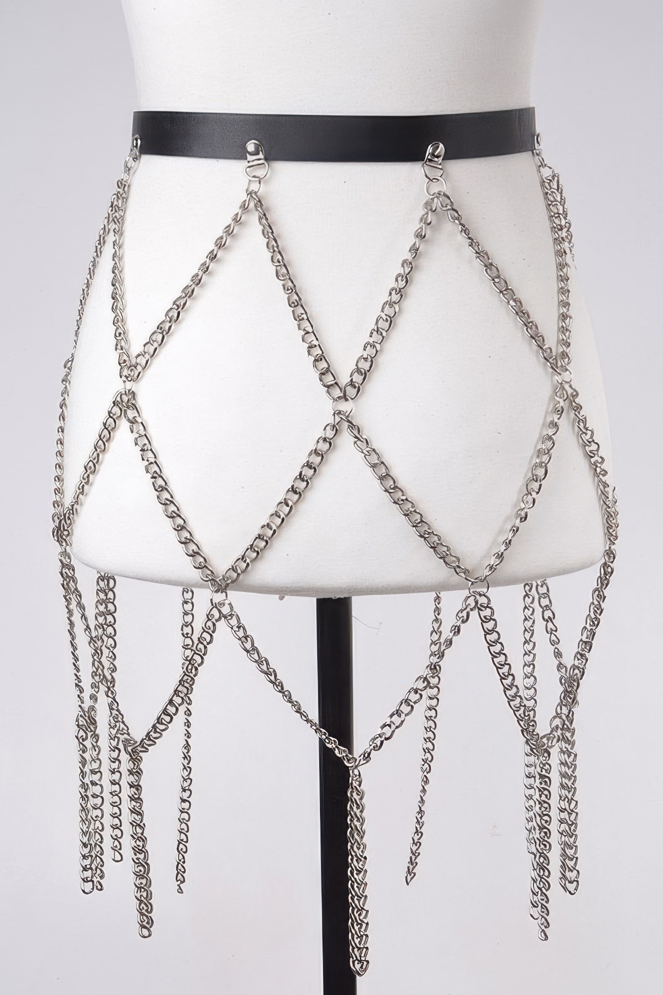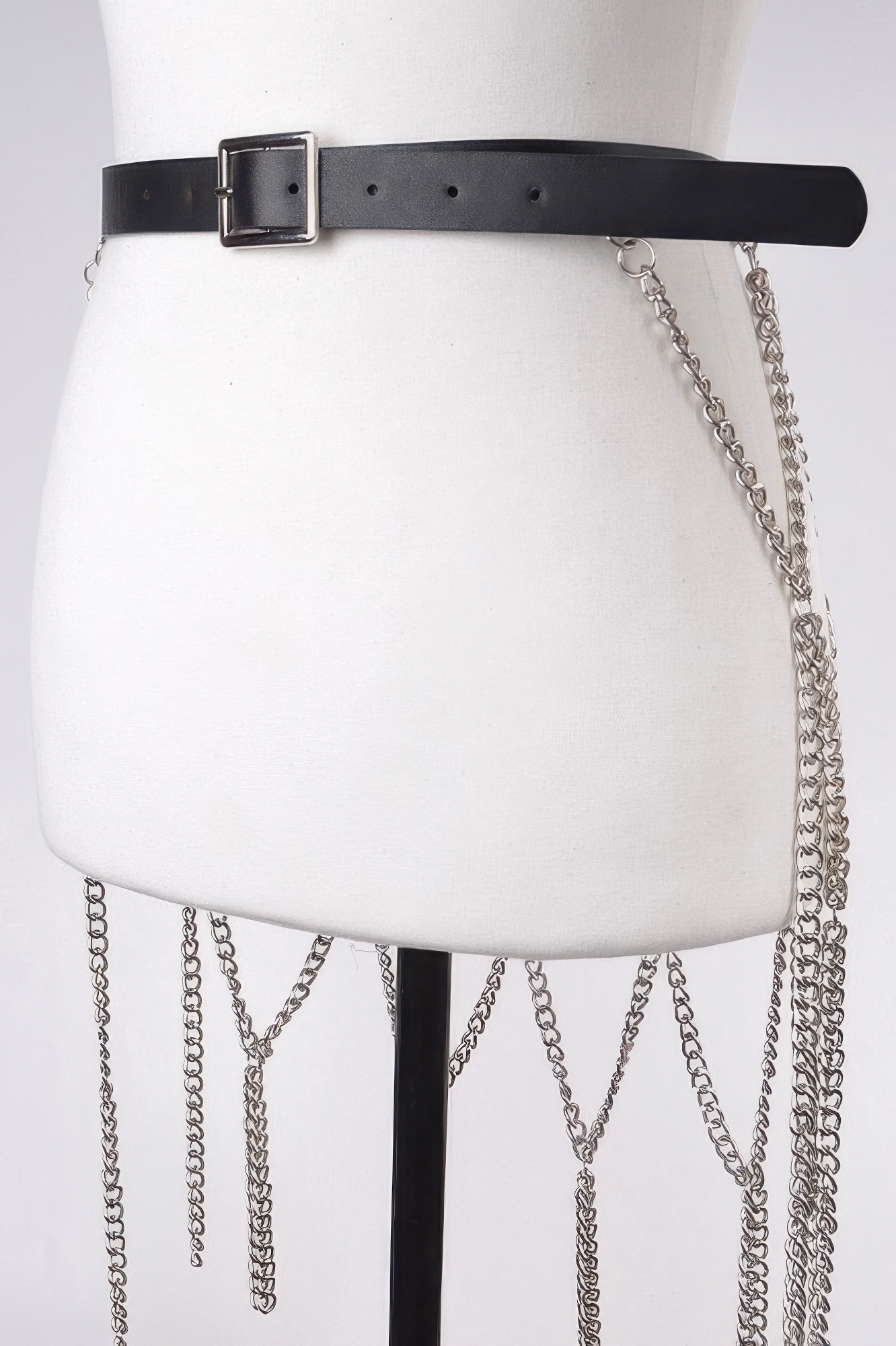 This leather belt with chain skirt features a unique layered design combining a slim belt with cascading chain details for a bold and edgy look. The chain elements add movement and dimension, creating a standout silhouette. Its adjustable length allows for flexible styling. Lightweight and versatile, it pairs well with statement outfits. A distinctive accessory, it adds a modern and fashion-forward touch.