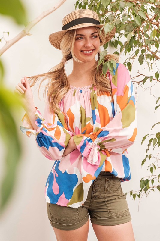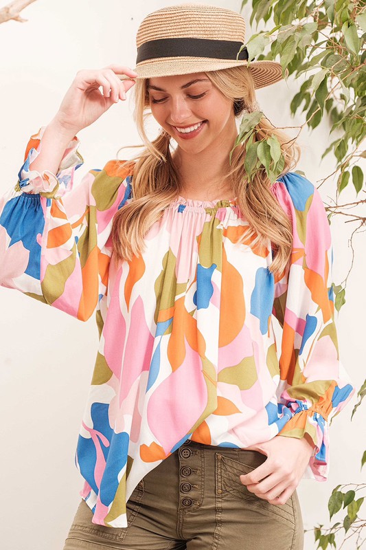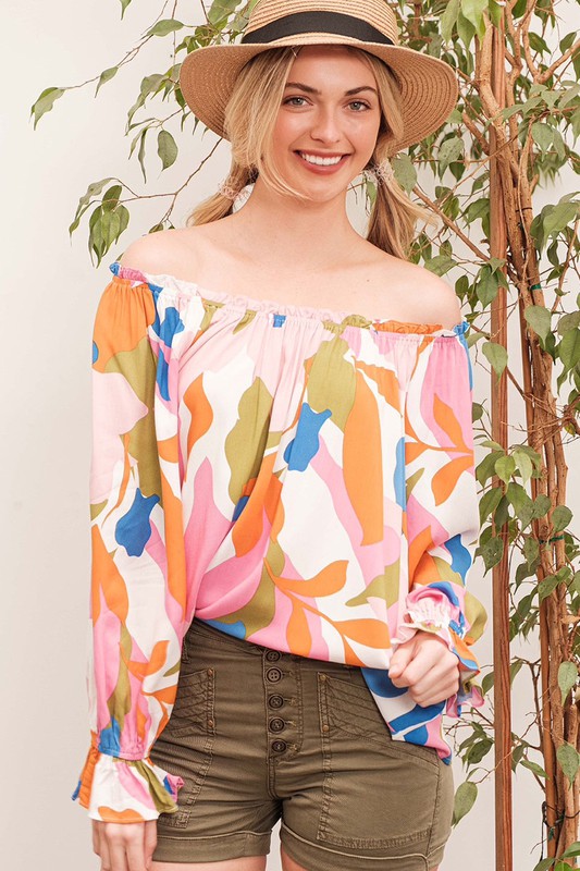 Make a bold statement with this abstract print off-the-shoulder long sleeve top. The abstract print adds a modern and artistic touch to the top. The off-the-shoulder design is chic and trendy, perfect for showcasing your shoulders. Pair with jeans or trousers for a stylish and fashion-forward look. Elevate your outfit with this unique and eye-catching top.