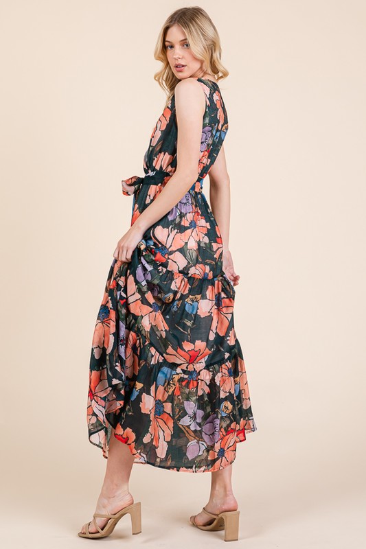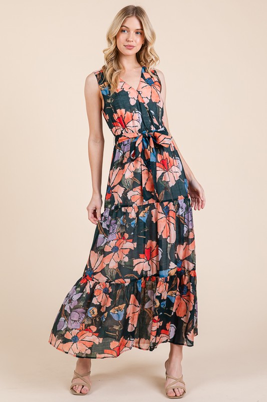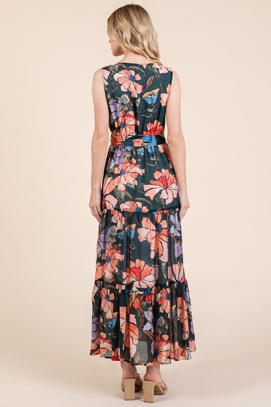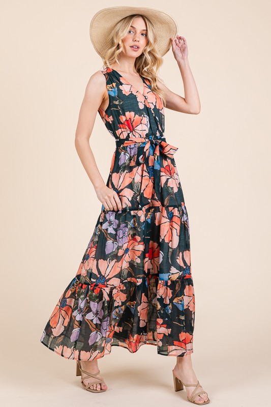 Embrace the summer vibes with this Floral Print Sleeveless Tie Waist Maxi Dress. The floral print adds a touch of femininity and elegance to the dress. The tie waist detail cinches in the waist for a flattering silhouette. Perfect for a beach day or a summer outing. Pair with sandals and a sun hat for a chic and effortless look. Stand out in style with this stunning and flowy maxi dress.