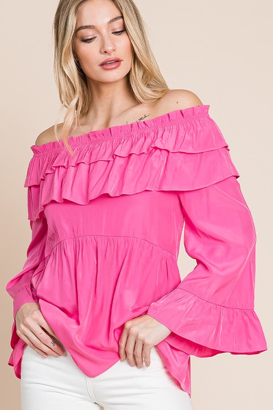 Make a statement in this solid ruffled trumpet sleeve off-the-shoulder top. The trumpet sleeves add a touch of drama and flair to the top. The off-the-shoulder neckline is feminine and on-trend. The ruffled detailing creates a romantic and playful look. Pair with jeans or a skirt for a stylish and chic outfit. Embrace a fashion-forward style with this trendy and versatile top.