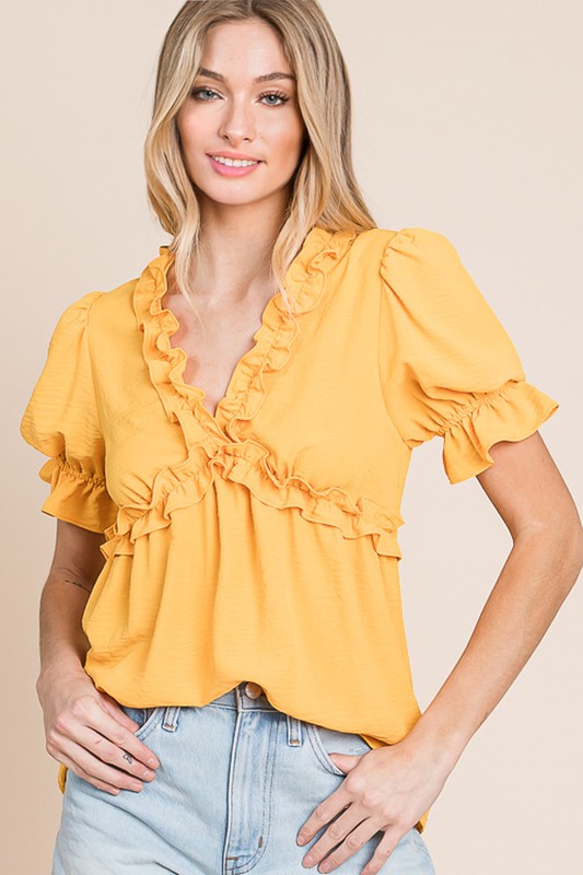 Elevate your look with this ruffled deep V-neck puff sleeve babydoll top. The deep V-neckline adds a touch of allure to the top. The ruffled details offer a feminine and romantic flair. The puff sleeves create a dramatic and stylish silhouette. Perfect for dressing up a casual outfit or adding a chic touch to a night out ensemble. Embrace a fashion-forward style with this trendy and versatile top.