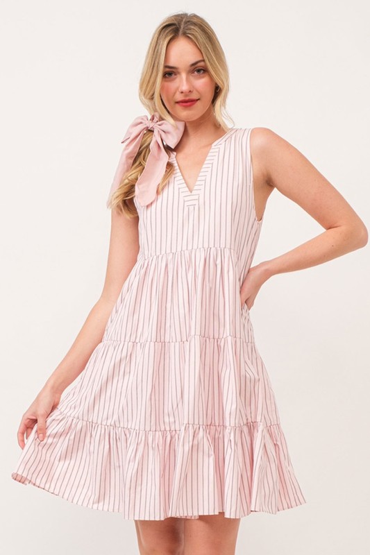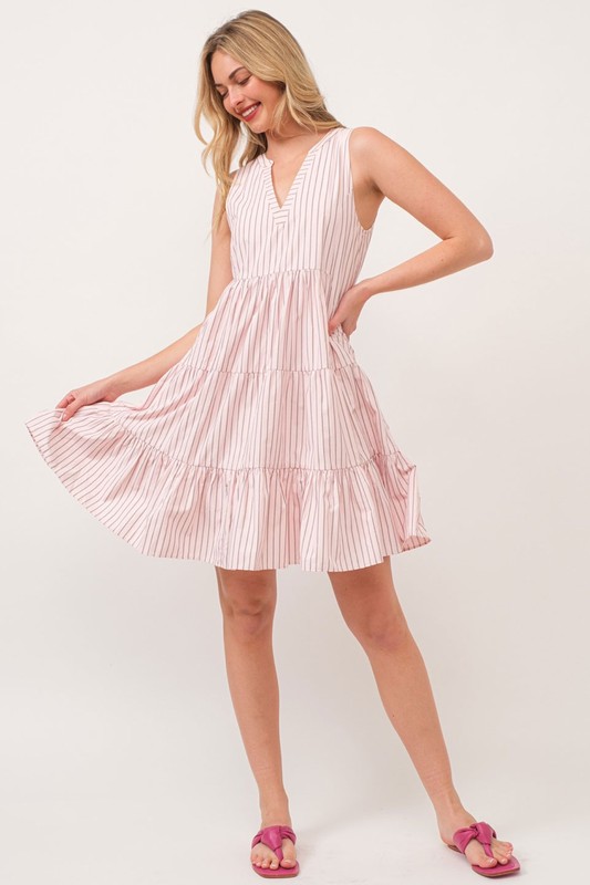 This sleeveless V-neck tiered dress features a stylish striped pattern for a fun and chic look. The V-neck design adds a flattering touch to the neckline. Perfect for a casual yet fashionable outfit in warm weather.