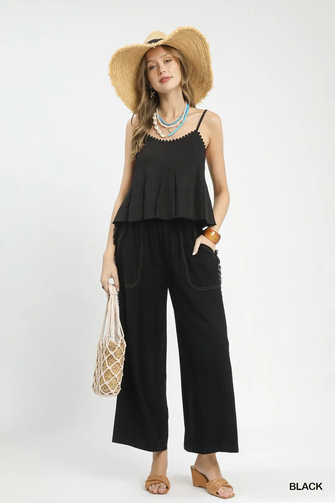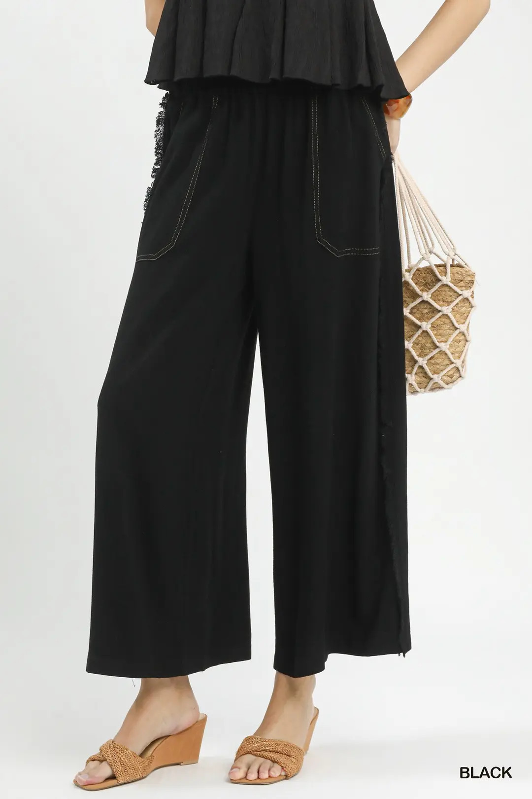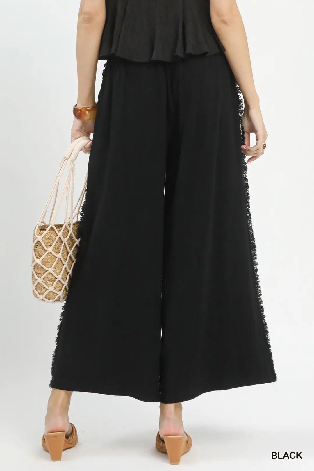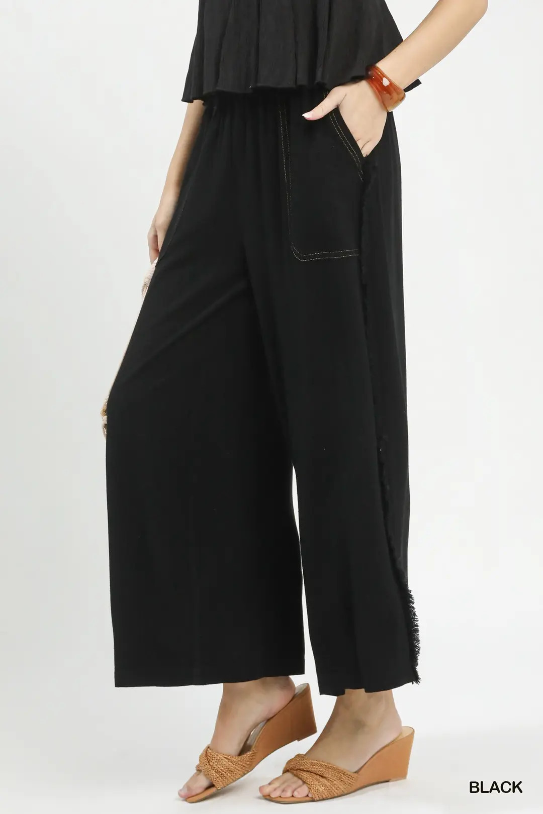 Crafted from linen, these wide leg pants feature a comfortable elastic waistband for a relaxed fit. The side frayed trim detail adds a touch of edge to the classic silhouette. Front patch pockets offer practicality and style, perfect for storing your essentials. These pants are versatile and lightweight, ideal for everyday wear. Embrace a laid-back and stylish look with these linen wide leg pants.