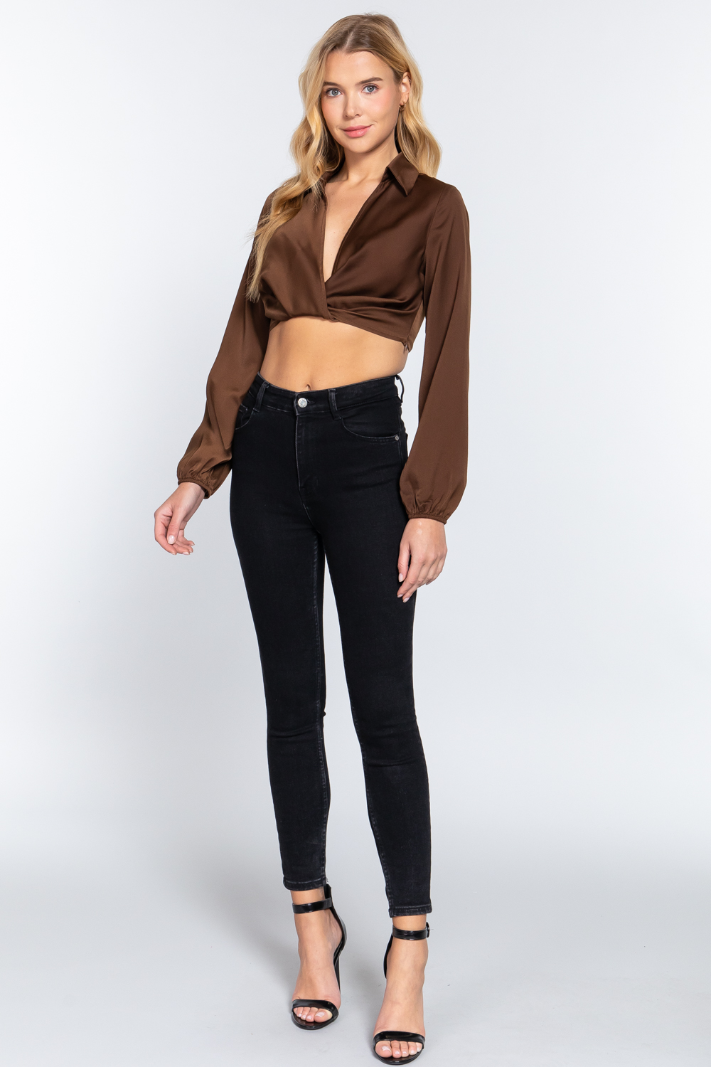 Product Description Imported S.M.L LONG SLEEVE NOTCHED COLLAR FRONT TWISTED DETAIL CROP WOVEN TOP 100% Polyester Silk Brown LC19-07 Item Measurements: SIZE:S Measurements: SIZE SLength:13.5" Waist:28" Bust:30"