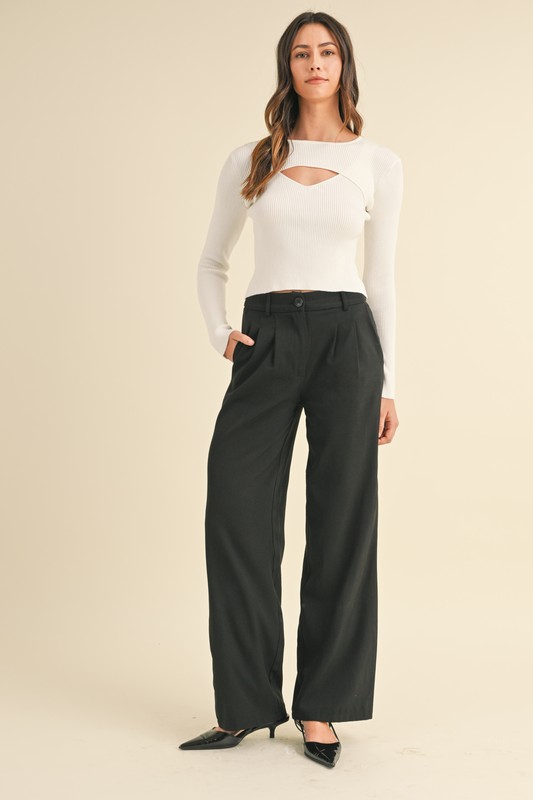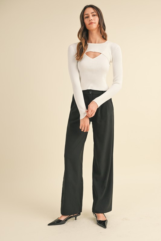 This cut out long sleeve ribbed knit top is a modern and edgy piece that adds a unique twist to your outfit. The cut out detailing gives it a contemporary and stylish look, perfect for a statement piece. Elevate your style with this trendy ribbed knit top that offers a chic and fashion-forward silhouette.