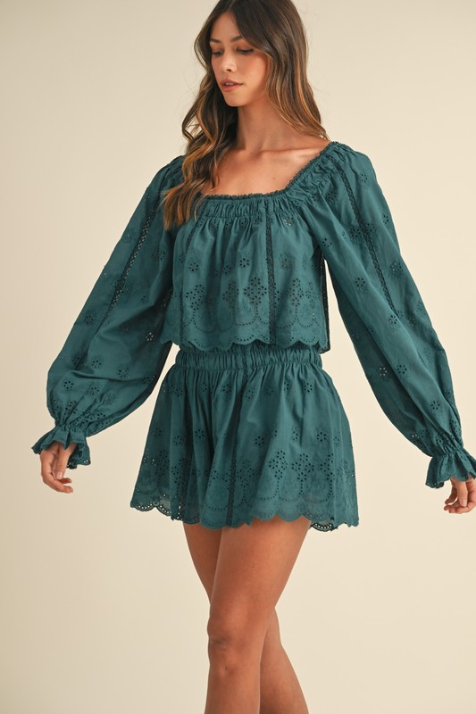 An embroidered scalloped lace top and short set is a romantic and elegant outfit choice, perfect for special occasions and date nights. The intricate details add sophistication and femininity to the ensemble, making it a stylish statement piece. Pair with heels and delicate jewelry to complete the look and enhance its elegant vibe.