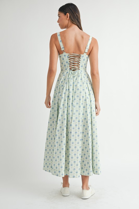 A floral print bustier back lace-up midi dress is an elegant and romantic dress featuring a floral pattern, a flattering bustier bodice, and a lace-up detail at the back. This midi dress exudes femininity and sophistication, perfect for special occasions or date nights. The lace-up back adds a touch of allure and allows for an adjustable fit, while the floral print adds a whimsical and charming vibe. Pair this dress with heels and delicate accessories for a stunning and fashionable look.