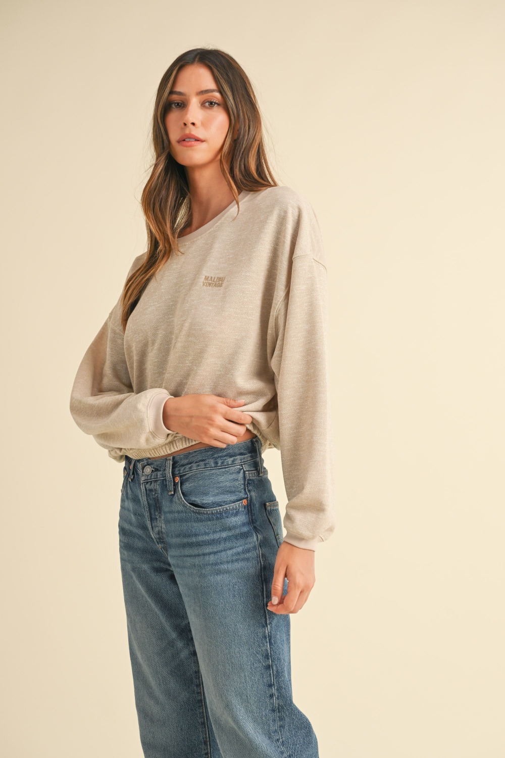 This stylish sweatshirt features a round neck and long sleeves, with a cropped length for a modern touch. The standout detail is the "MALIBU VINTAGE" embroidery lettering on the front, adding a trendy and unique element to the design. The round neck offers a classic and versatile neckline that pairs well with a variety of bottoms. The pullover style makes it easy to wear and style for a casual yet fashionable look. This crop sweatshirt is a great choice for adding a touch of street style and comfort to your wardrobe. Perfect for layering or wearing on its own, it's a versatile piece for creating cool and casual outfits.