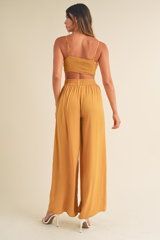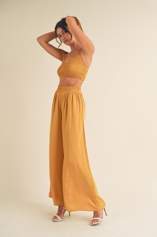 This Smocked Bralette Crop Top and Wide Leg Pants Set is a trendy and chic ensemble perfect for a casual yet stylish look. The smocked detailing on the bralette adds a touch of texture and dimension to the outfit. Paired with the flowy wide-leg pants, this set offers a comfortable and effortless style that is perfect for a day of shopping or a brunch with friends. Stay on-trend and comfortable with this fashionable set.