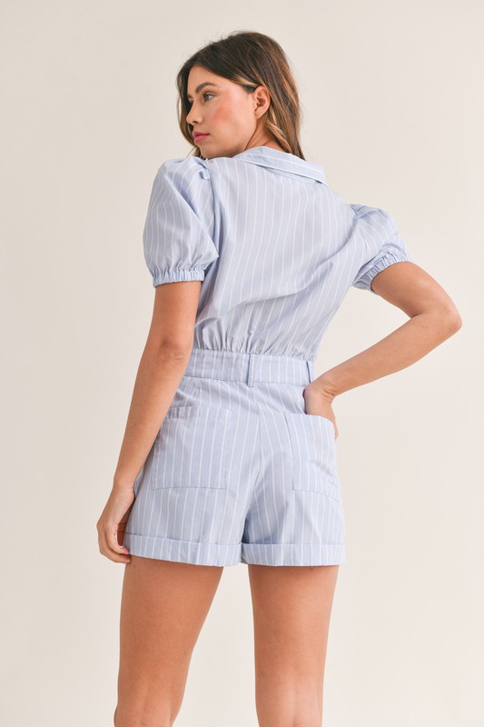A striped puff sleeve collared neck romper is a fashionable and on-trend piece for your wardrobe. The striped pattern adds a classic touch to this romper style, while the puff sleeves bring a stylish silhouette. Perfect for a variety of occasions, this romper exudes charm and sophistication. Enjoy the chic look and versatility of this trendy romper!