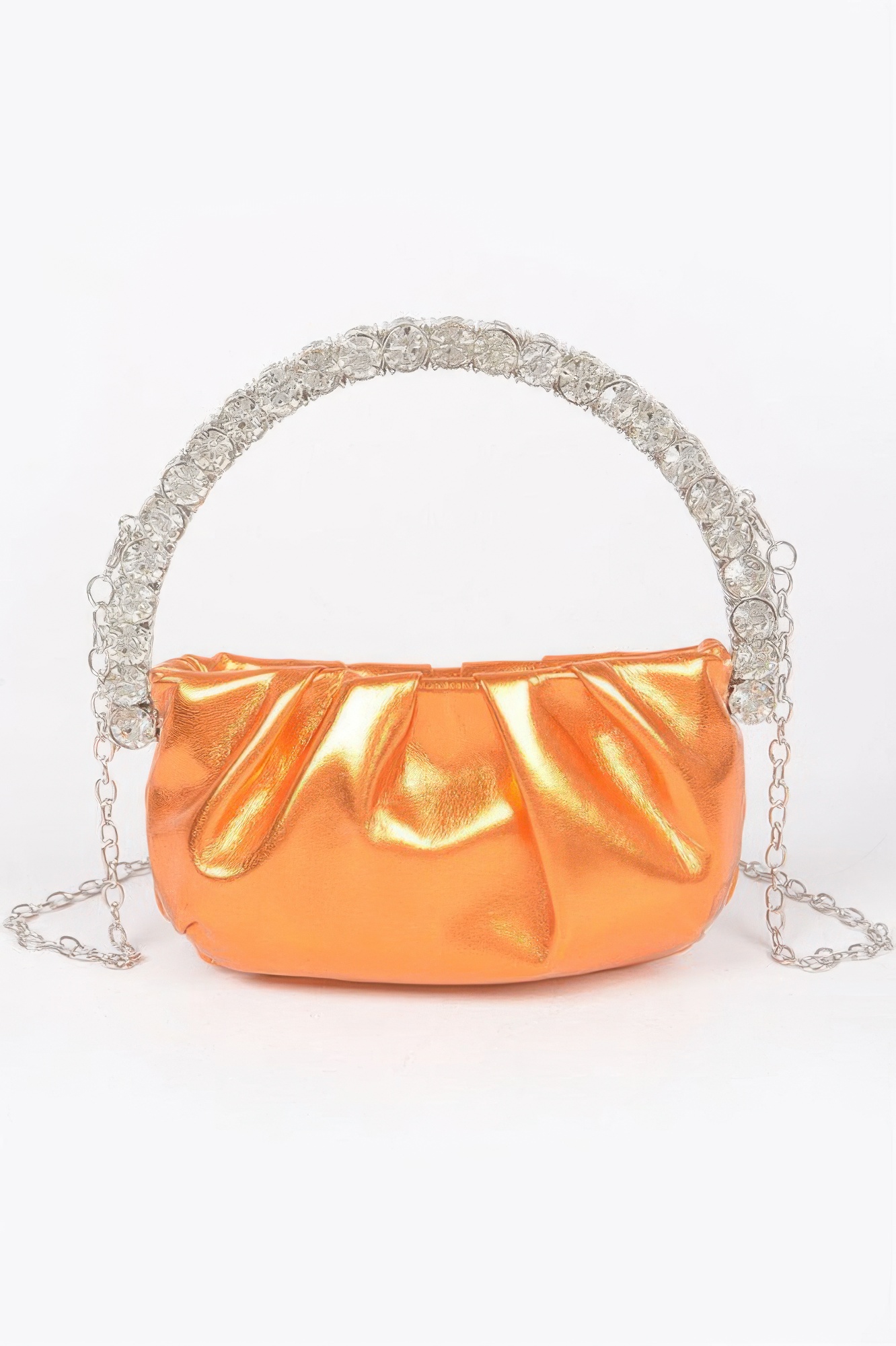 Polished and petite, the Metallic Stone Handle Crossbody Bag offers a bold metallic finish with a luxe stone accent. Compact and structured, it features a high-shine body with a sculptural handle that doubles as a statement detail. The crossbody strap provides versatile wear, making it ideal for evenings out, cocktail hours, or fashion-forward events. Small in size but big on impact, this bag elevates any look with ease.