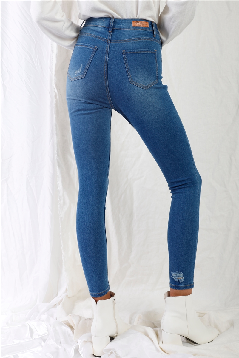 Denim, mid blue, high rise, five pockets construction, small rips on the leg bottom & on the pockets, belt loops, contrast thread stitch, back brand patch, hardware merchandised buttons, skinny fit, stretchy, front fly zipper, front button closure, simple design, high quality jeans, all-season wear, stylish, casual, wardrobe must have