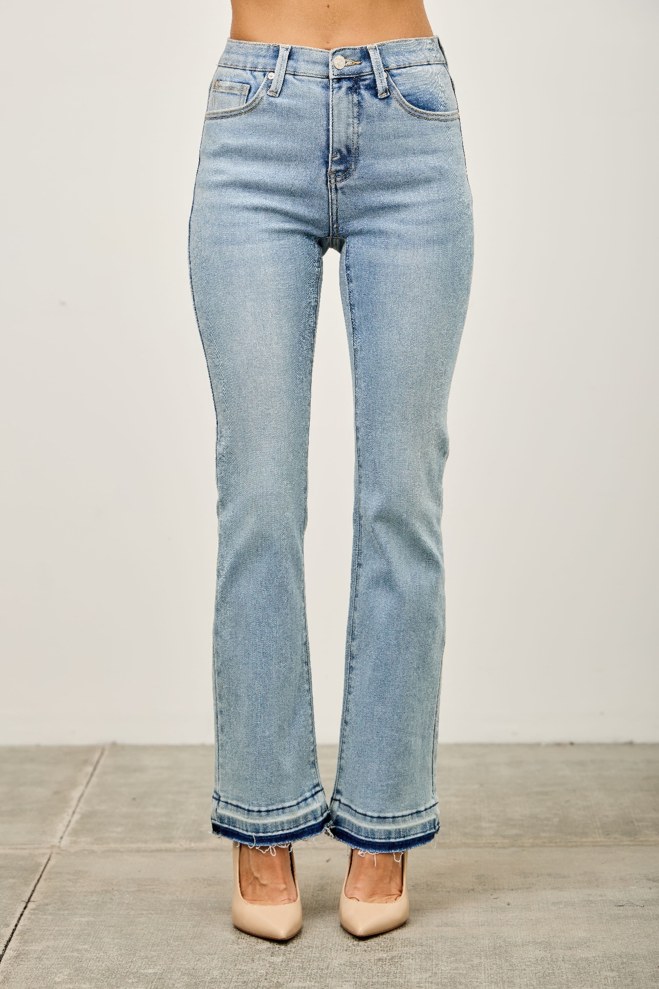 Step into retro-inspired style with this modern take on the classic flare. These mid-rise jeans feature a soft stretch blend for a comfortable, flexible fit that moves with you. Designed with a subtly flared leg and a released hem, they offer a laid-back finish that feels effortlessly cool. The classic 5-pocket styling and zipper fly keep the look timeless, while the raw hem adds a hint of edge. Whether dressed up with heels or styled casually with sneakers, these flares bring versatile style to any wardrobe.
