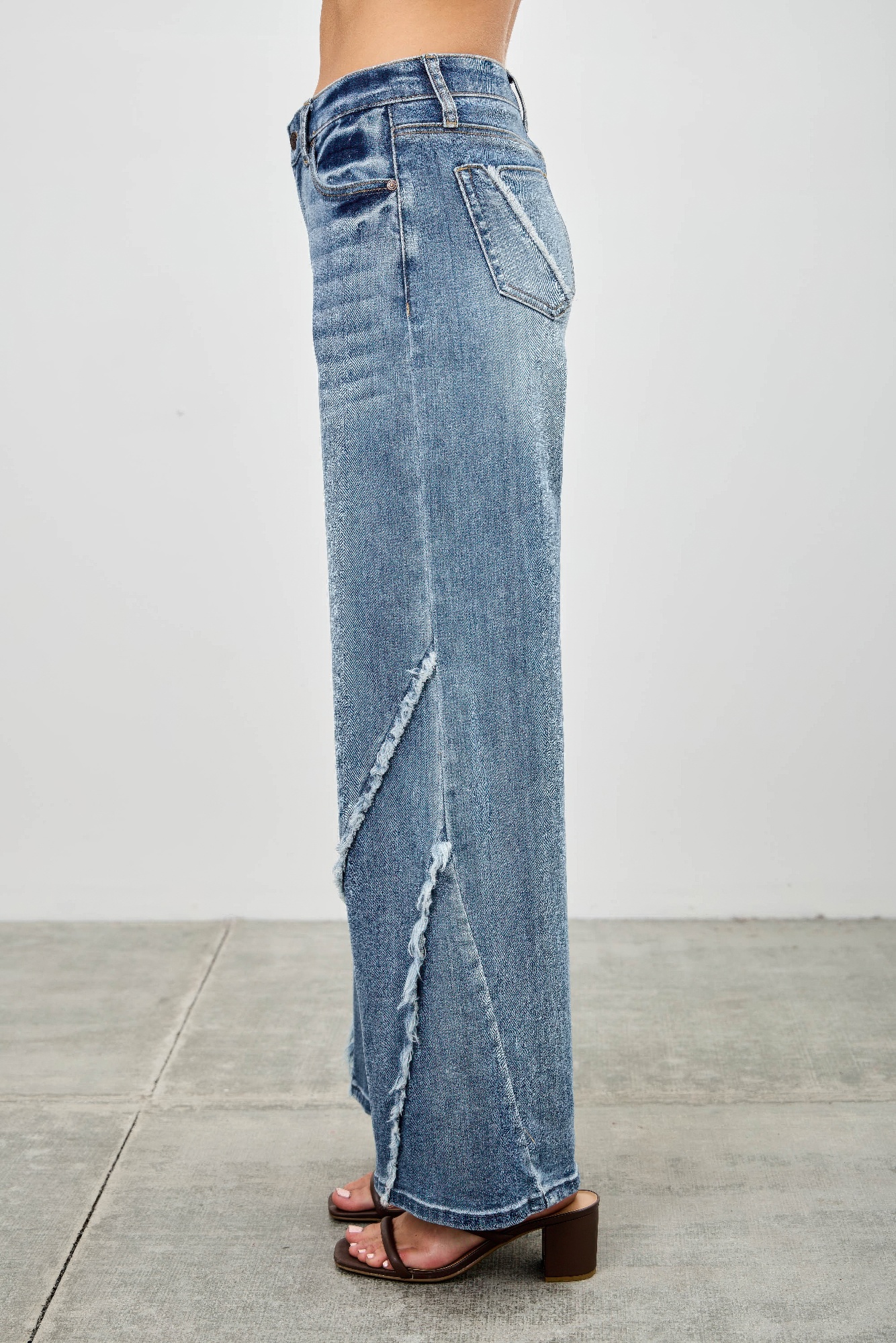 Designed for comfort and effortless style, these mid-rise jeans feature a flattering wide-leg silhouette with eye-catching frayed seams. Crafted from a soft, stretch-infused blend, they offer ease of movement without compromising shape. The mid-rise waist pairs seamlessly with cropped tops or tucked-in blouses for a balanced, modern look. Classic 5-pocket styling and a zipper fly closure provide timeless functionality, while the raw seam detail adds a hint of edge. These jeans transition easily from casual outings to dressed-up occasions with the right accessories.