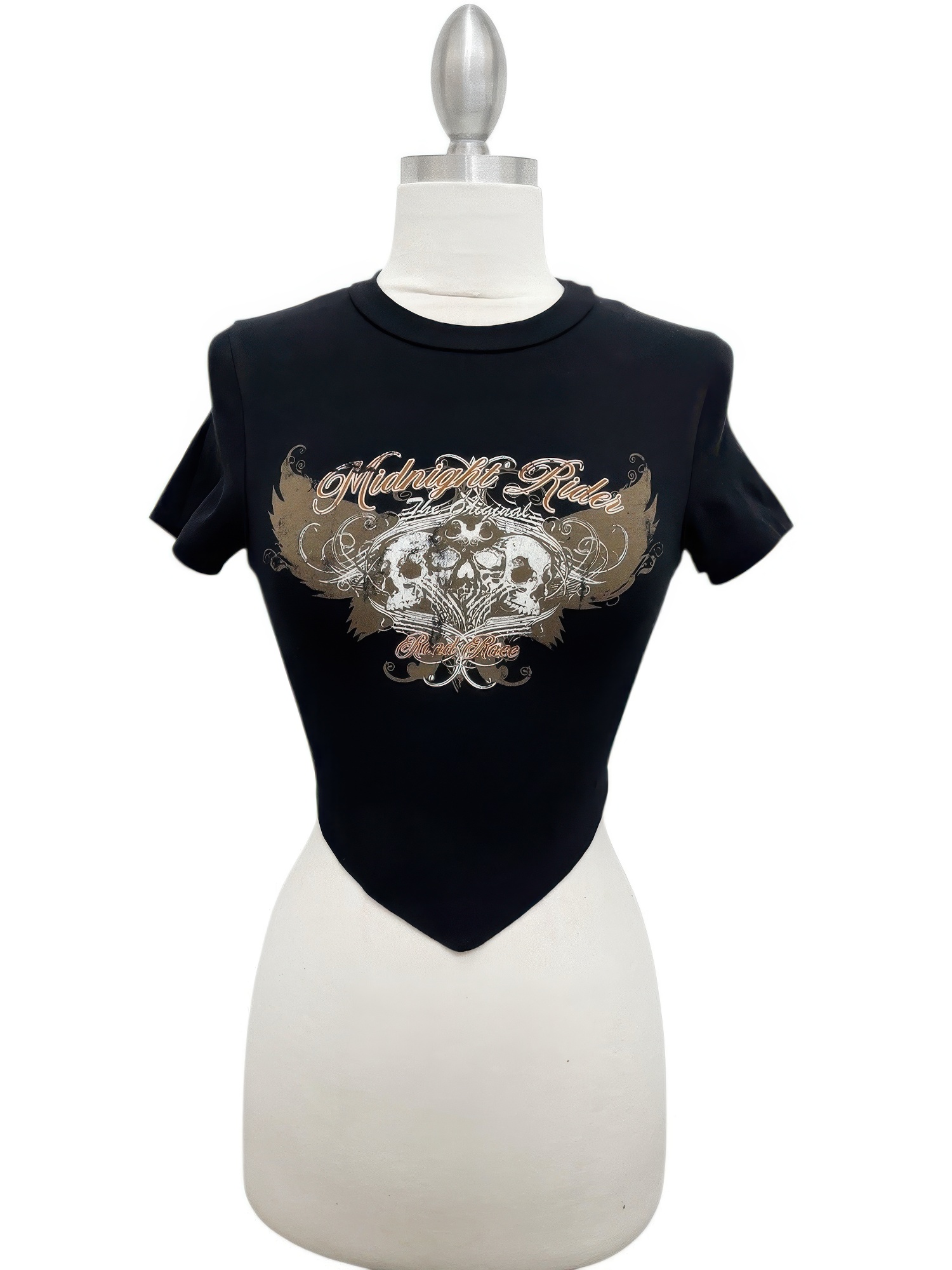 The Midnight Rider Graphic Cropped Tee combines bold attitude with a flattering, modern fit. Designed with a cropped silhouette, this tee contours comfortably while offering a confident, on-trend look. The soft cotton blend with added stretch ensures flexibility and all-day comfort. A classic round neckline and short sleeves keep the style versatile and easy to wear. Finished with a striking screen-printed graphic, this piece pairs effortlessly with high-rise denim, cargos, or layered styling. It’s a statement essential that brings edge and ease to your everyday wardrobe.