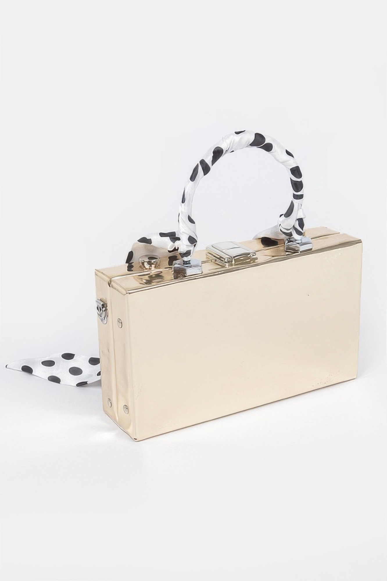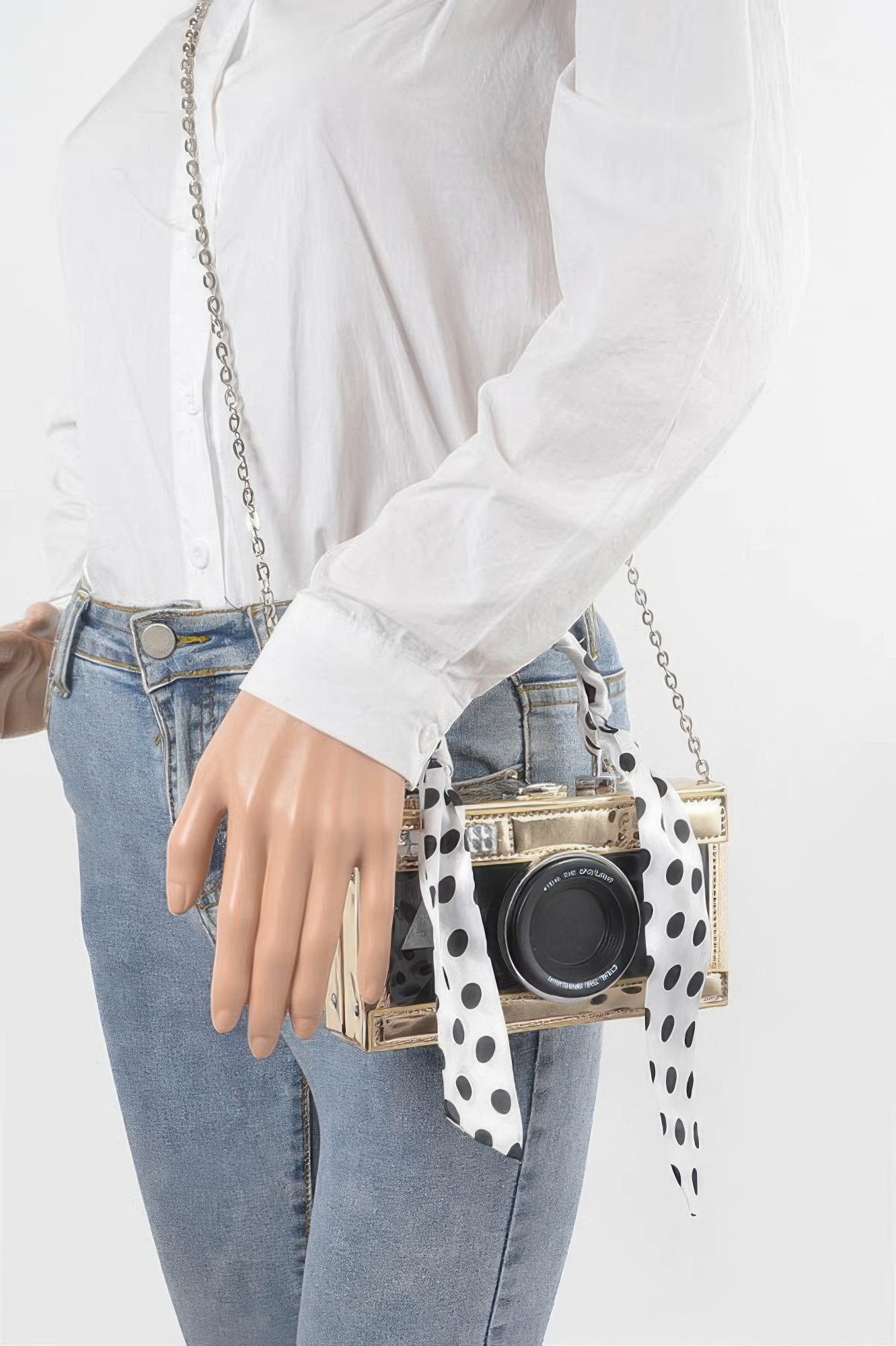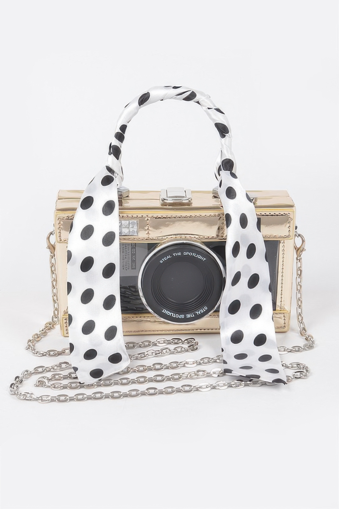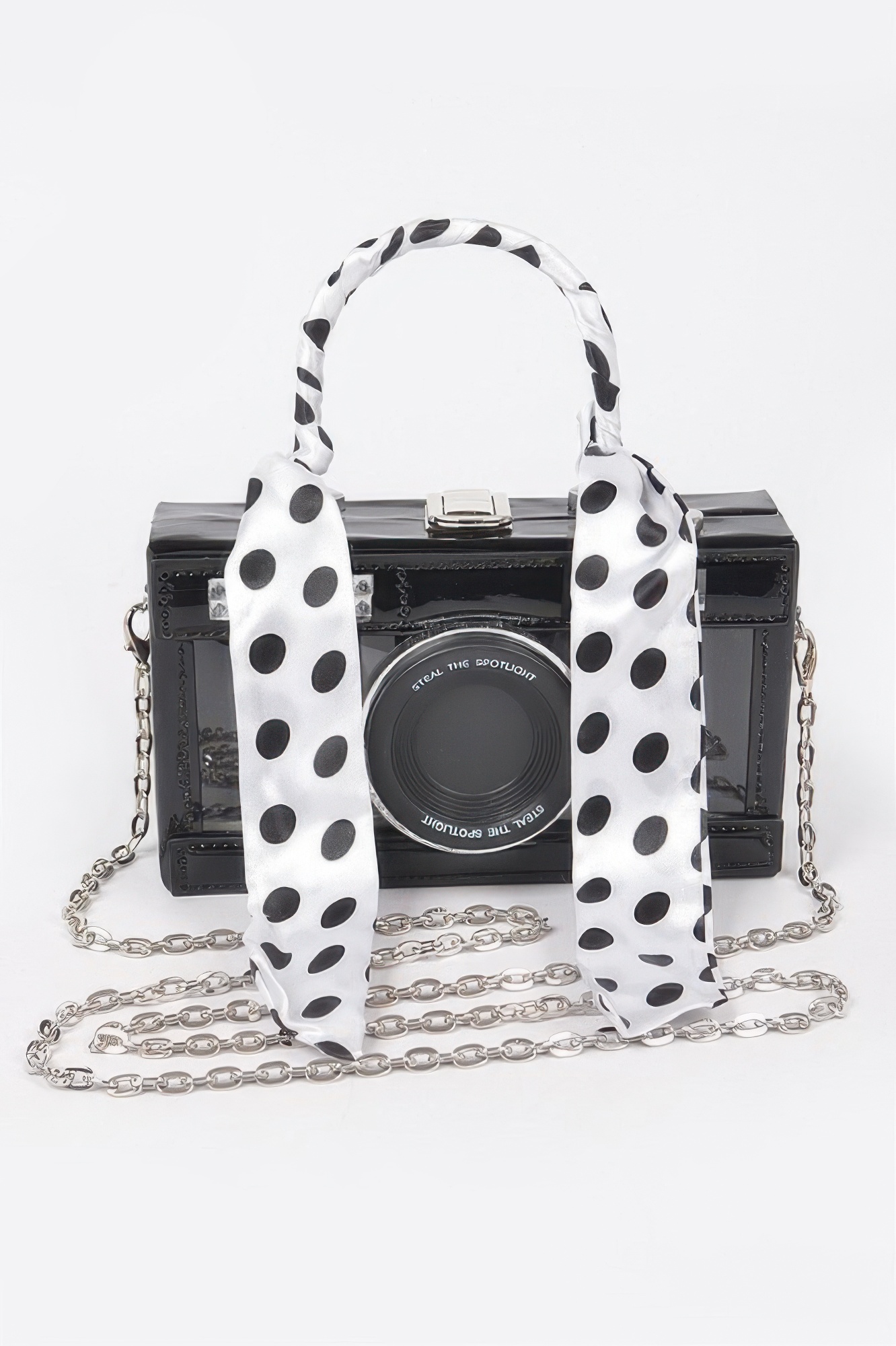 Make a bold entrance with this mirror vegan leather clear top handle camera clutch, designed for modern sophistication. Crafted from structured polyurethane with mixed metal accents, it combines sleek mirrored detailing with a transparent body for contemporary appeal. The compact silhouette offers just enough space for essentials while maintaining a polished profile. A structured top handle enhances its refined finish, while the camera-style shape adds edge. Ideal for evenings or events, it delivers statement style with versatility.