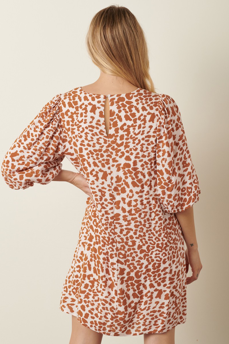 This mini dress features a trendy animal print design with puff sleeves for a stylish and bold look. Perfect for a night out or special event, the dress exudes a fierce and fashionable vibe. The mini length adds a flirty touch to the statement silhouette. Make a statement in this eye-catching animal print mini dress with puff sleeves!