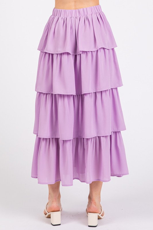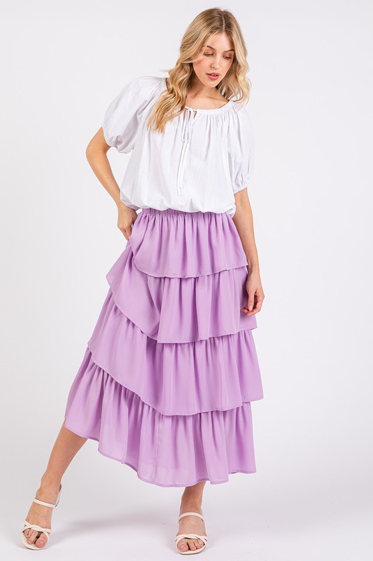 The Chiffon Ruffle Layer Elastic Waist Midi Skirt is a beautiful and graceful addition to your wardrobe. It features cascading ruffle tiers that create a flowy and elegant silhouette. The elastic waistband offers a comfortable and adjustable fit for all-day wear. Perfect for both casual and dressy occasions, this midi skirt is versatile and easy to style. Pair it with a simple top and sandals for a casual look, or dress it up with heels and statement jewelry for a more formal outfit.