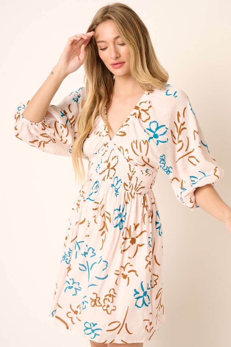 This mini dress features a vibrant flower print and a smocked waist for a flattering and stylish look. The flower print adds a playful and feminine touch to the dress. With a smocked waist detail, this dress cinches at the waist for a defined silhouette. Perfect for a casual or dressed-up occasion, this dress is both trendy and versatile. Elevate your wardrobe with this chic and on-trend flower print smocked waist mini dress!