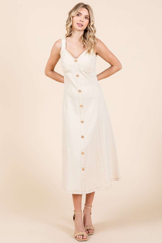 This stretch twill sleeveless midi dress is a sleek and versatile option for various occasions. The sleeveless design offers a timeless silhouette, while the midi length adds a touch of sophistication. Stay comfortable and chic in this stylish twill dress.