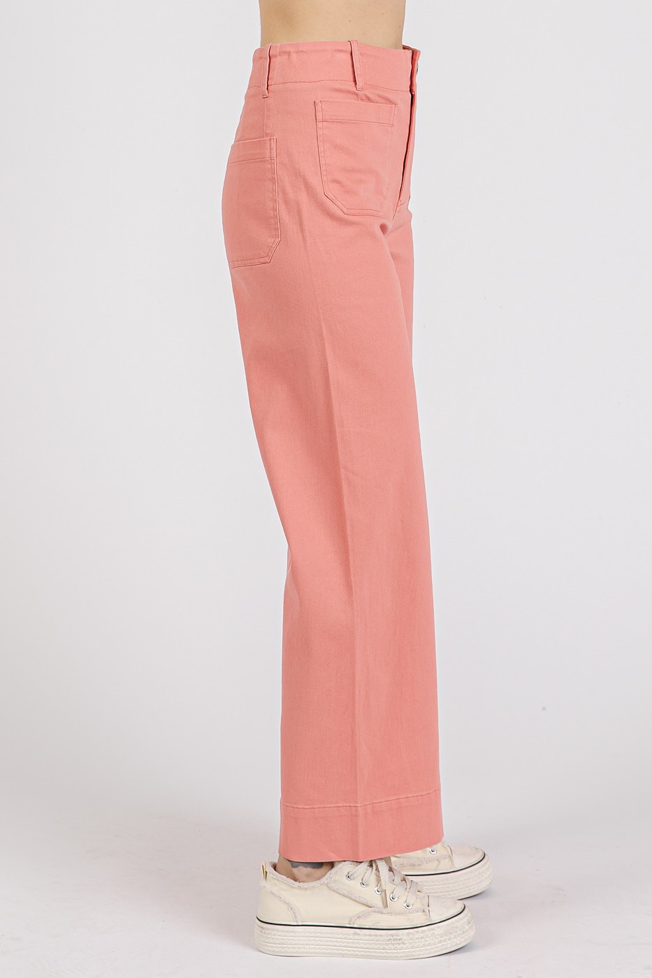 These wide leg pants are crafted from twill fabric and feature a high rise waist and patch pockets for a stylish and versatile look. Perfect for creating a chic and sophisticated outfit, the wide leg silhouette offers a fashionable and flattering fit. Pair these pants with a tucked-in blouse or sweater for a polished ensemble. Elevate your wardrobe with these twill patch pocket high rise wide leg pants!