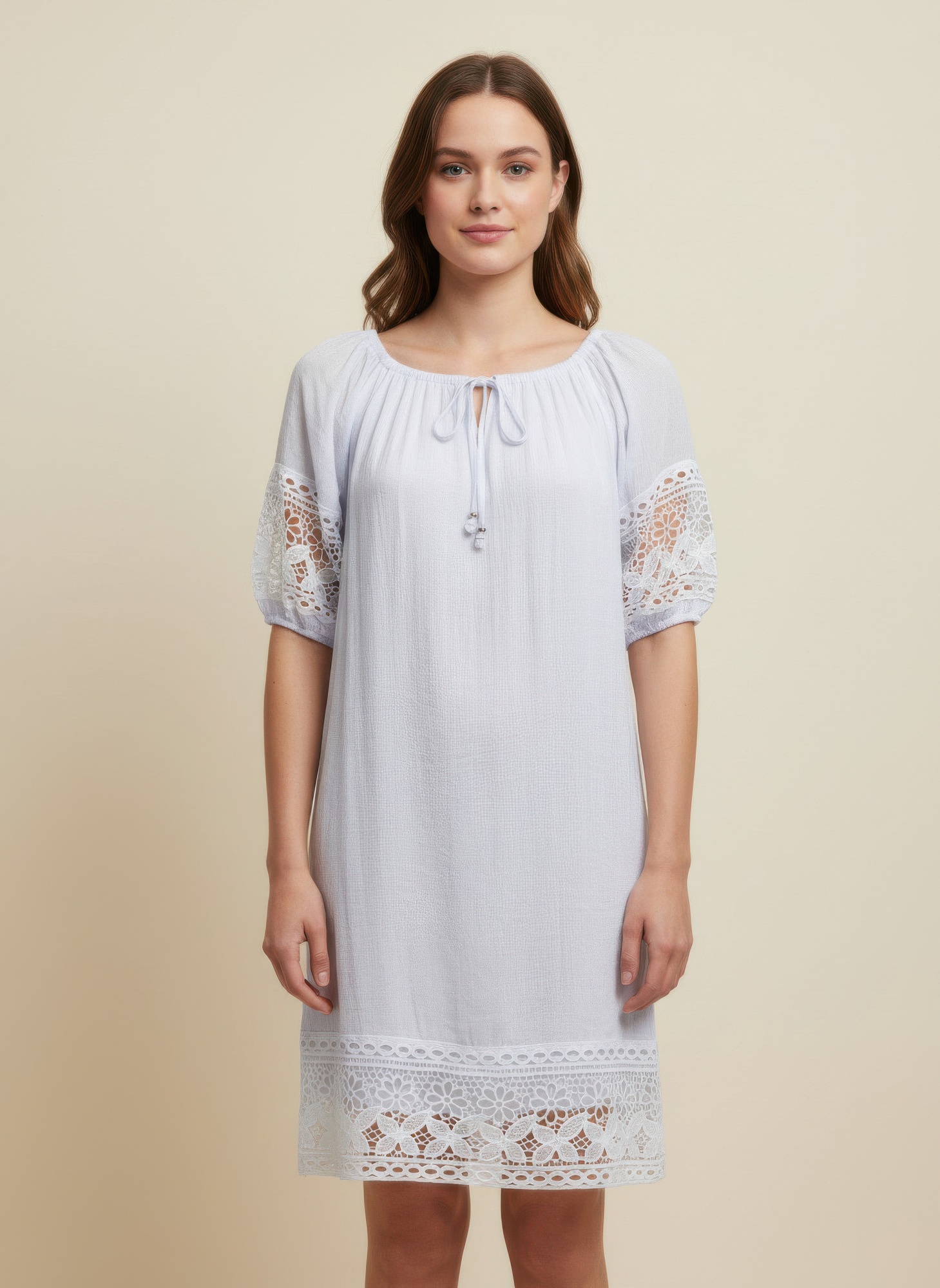 The Mlle Gabrielle Solid Short Sleeve Dress blends effortless charm with delicate detailing for a beautifully balanced look. Designed with soft elastic short sleeves and a notch elastic neckline, it offers a comfortable fit with subtle structure. Tasseled accents add a refined touch of texture, while crochet detailing along the sleeves and hem enhances its feminine appeal. Crafted from a breathable rayon-blend fabric and fully lined for added coverage, this dress feels as good as it looks. Perfect for daytime gatherings or relaxed evenings out, it delivers graceful style with everyday comfort.