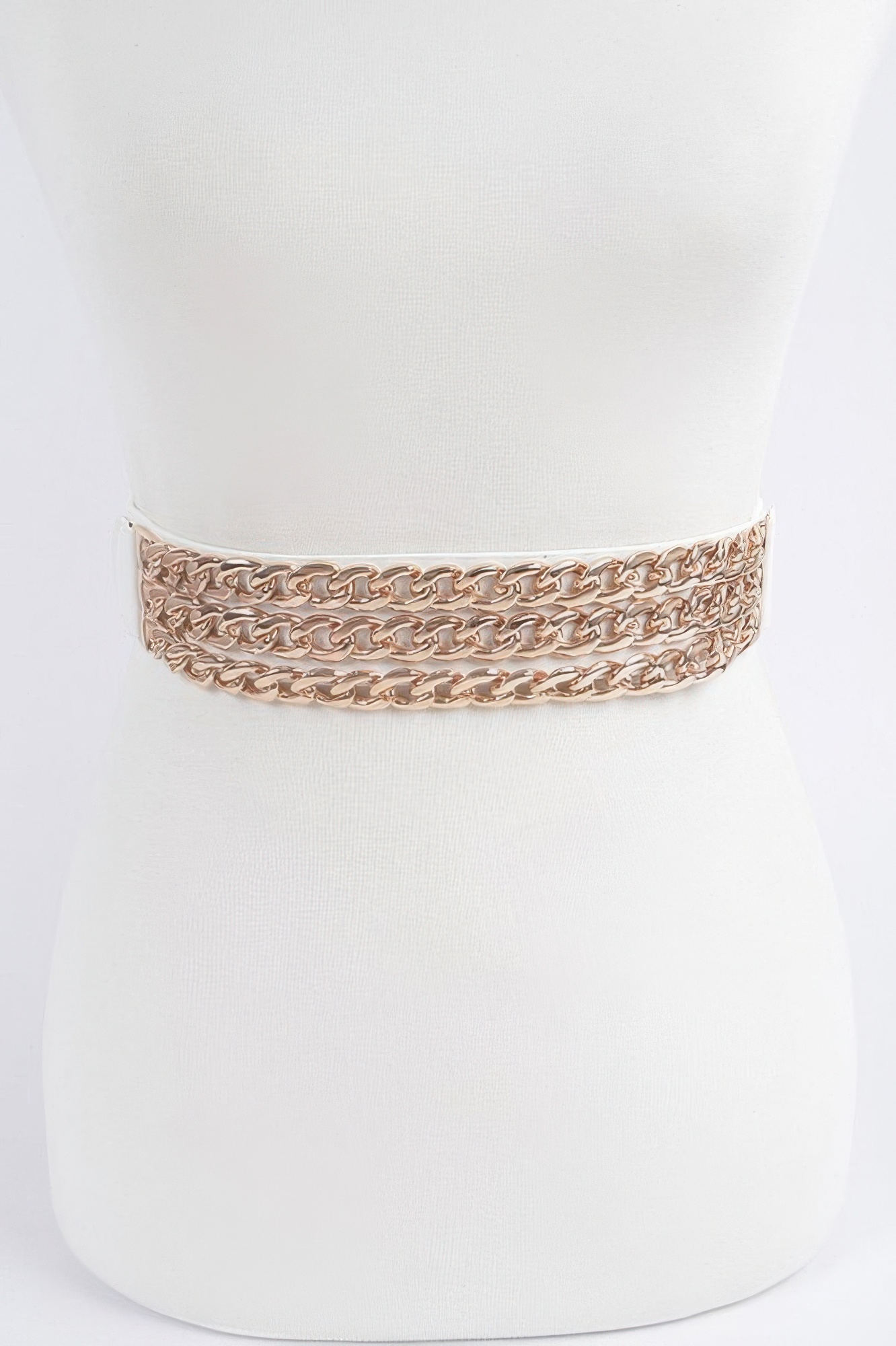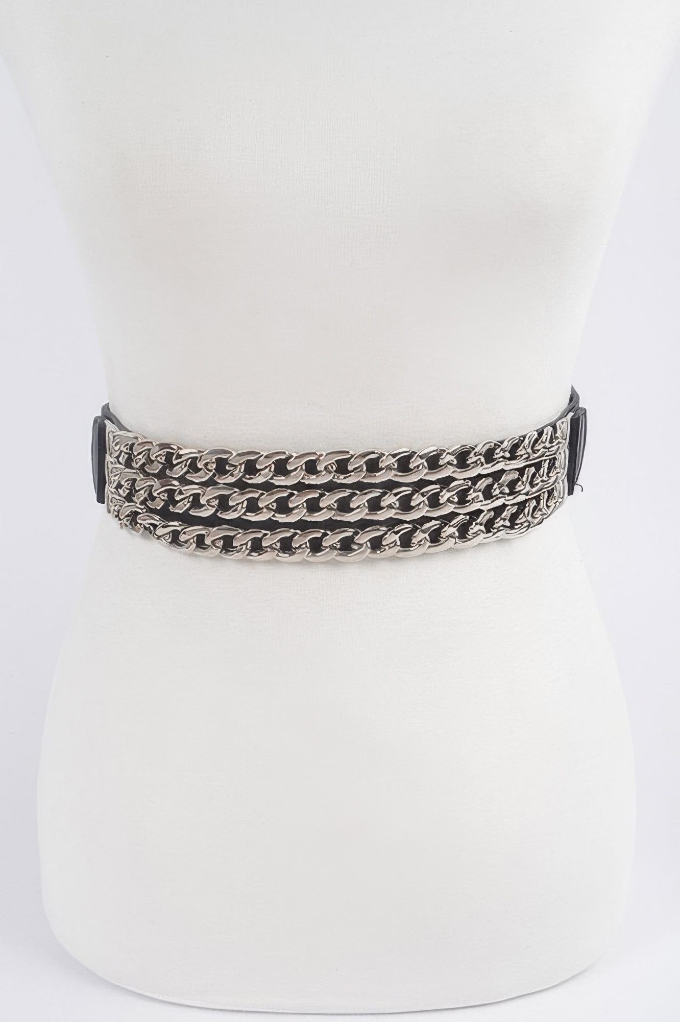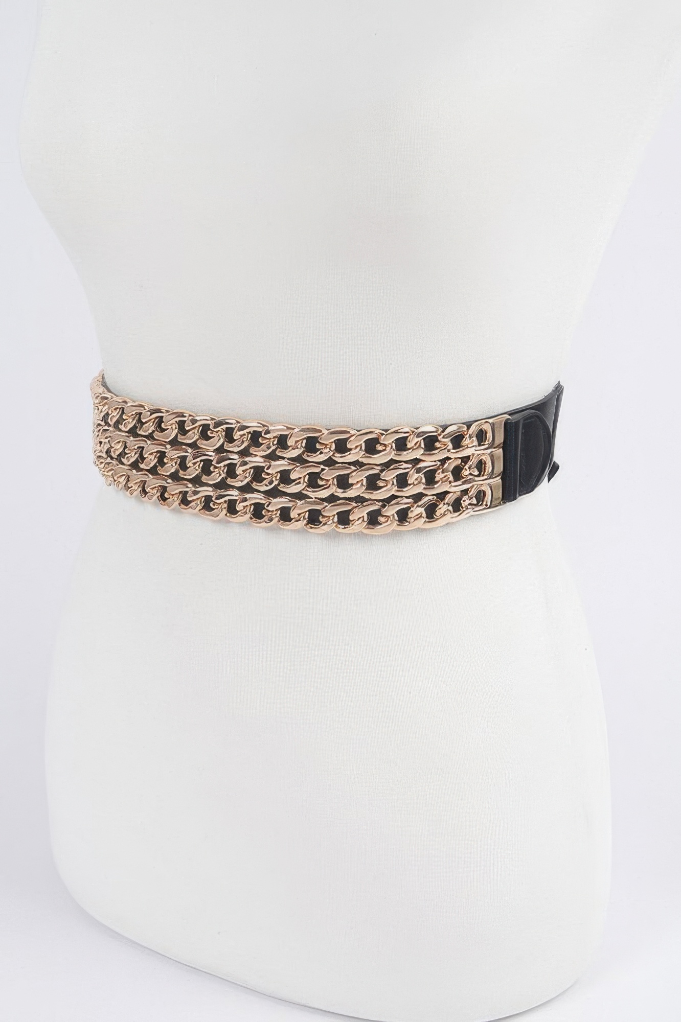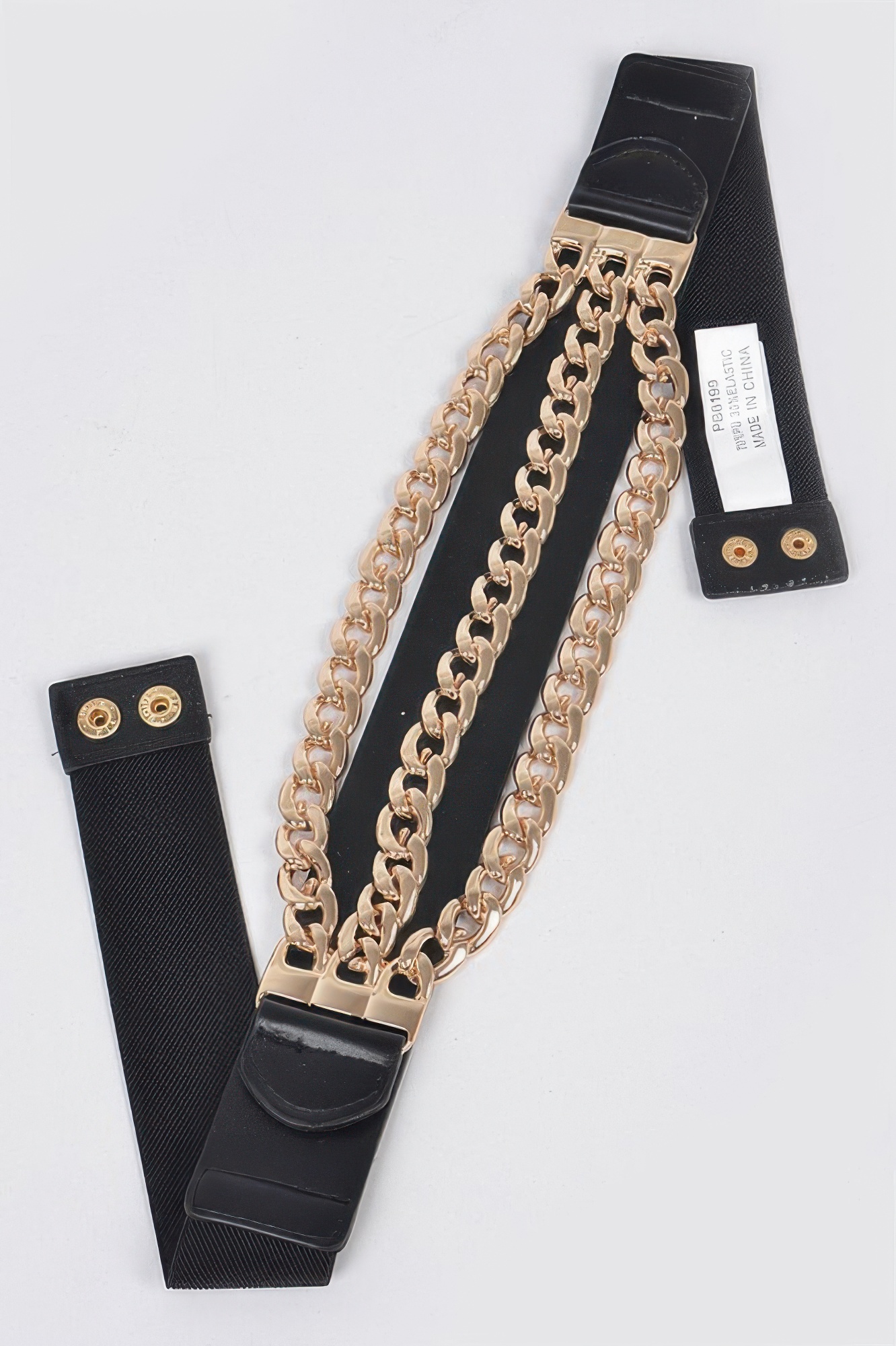 Add dimension to your outfit with this multi layered chain elastic belt, designed to enhance your silhouette with ease. The layered chain detail creates a bold yet balanced look, while the elastic construction ensures a comfortable and flexible fit. Its polished finish brings a refined touch to both casual and elevated ensembles. Ideal for cinching the waist, it offers both style and functionality. A standout accessory, it completes your look with effortless confidence.