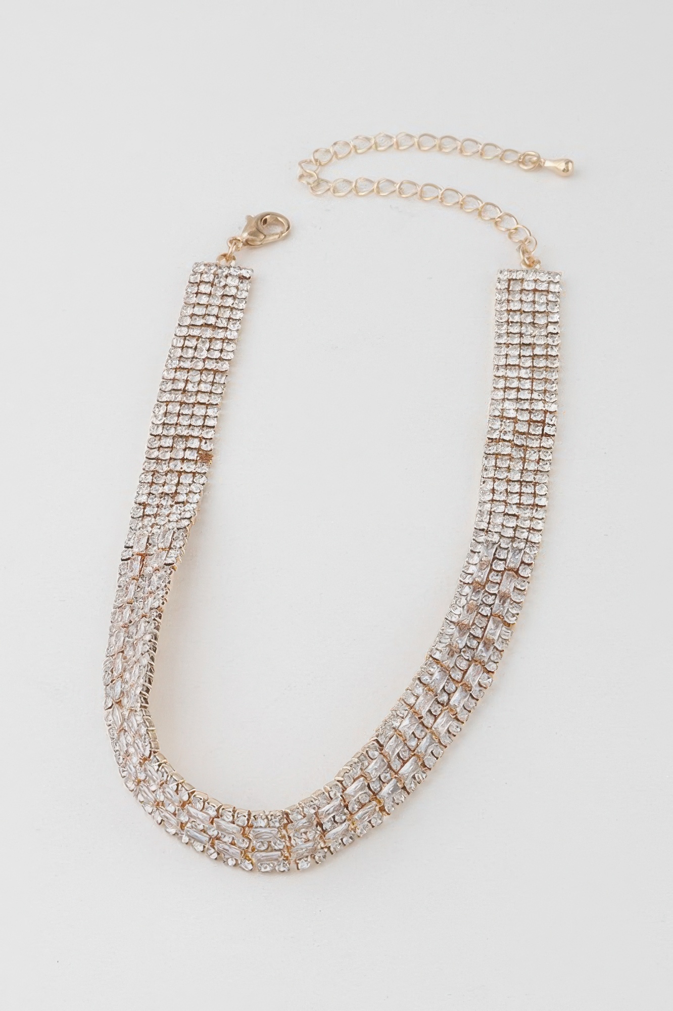 The Multi Rhinestone Crystal Choker Necklace delivers radiant sparkle with a bold, close-fitting silhouette. Featuring multiple rows of rhinestone crystals, this choker creates a glamorous layered effect that shines from every angle. Its short length highlights the neckline beautifully, making it a standout accessory for special occasions or evening looks. The brilliant crystal detailing adds a luxurious finish while maintaining a lightweight feel. Designed to capture attention, it pairs effortlessly with dresses, blouses, or formal wear. This choker is the perfect piece for adding dramatic sparkle to your jewelry collection.