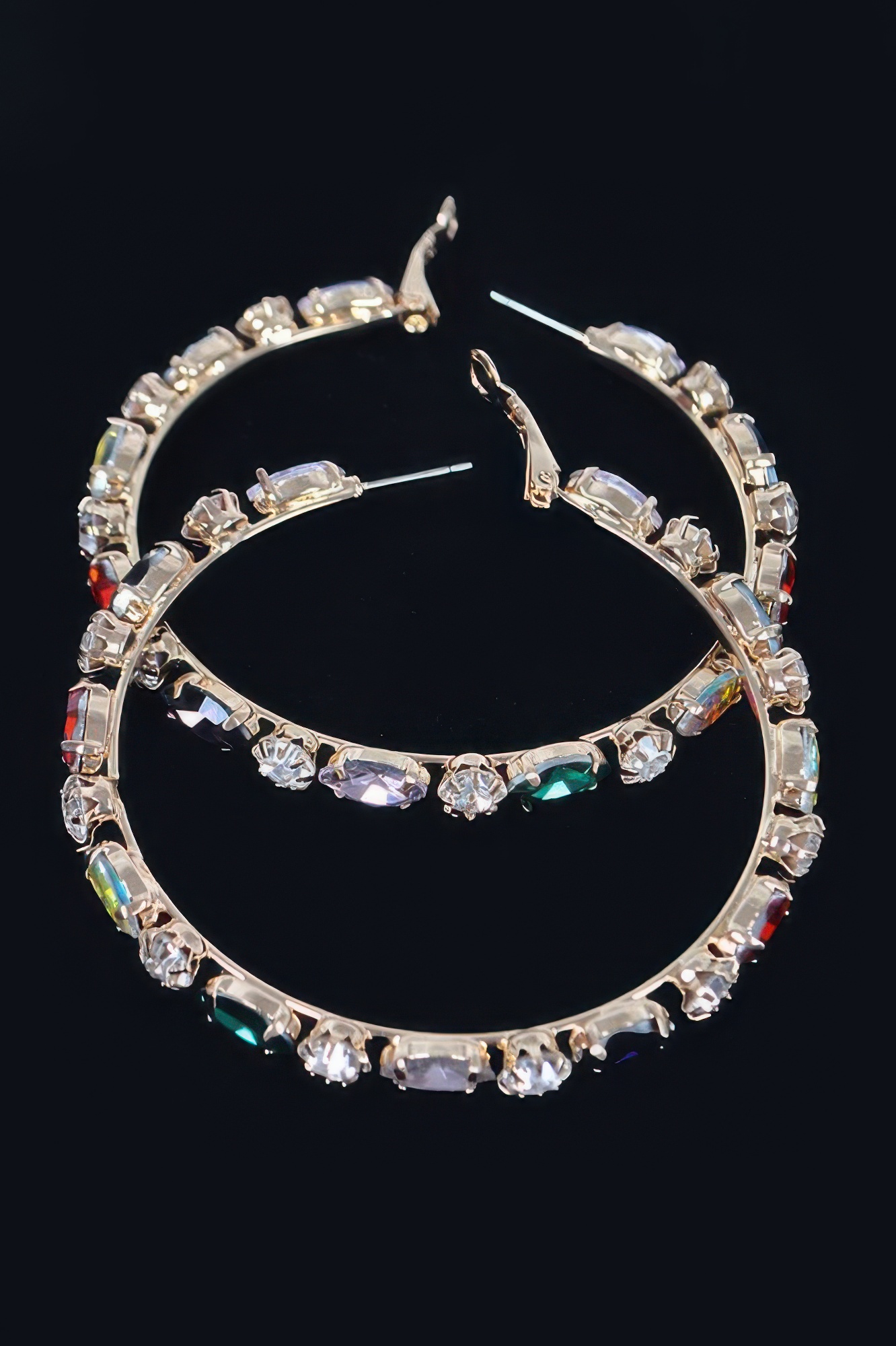 The Multi Rhinestone Hoop Earrings combine classic hoop styling with radiant sparkle. Designed with multiple rhinestones arranged along the hoop, these earrings catch light beautifully from every angle. The circular silhouette frames the face elegantly while adding a touch of glamour. Their versatile design allows them to complement both casual outfits and evening attire. Despite their statement appearance, they remain lightweight and comfortable to wear. The polished structure enhances the brilliance of the rhinestones. These hoops are a timeless accessory that adds sparkle to any jewelry collection.