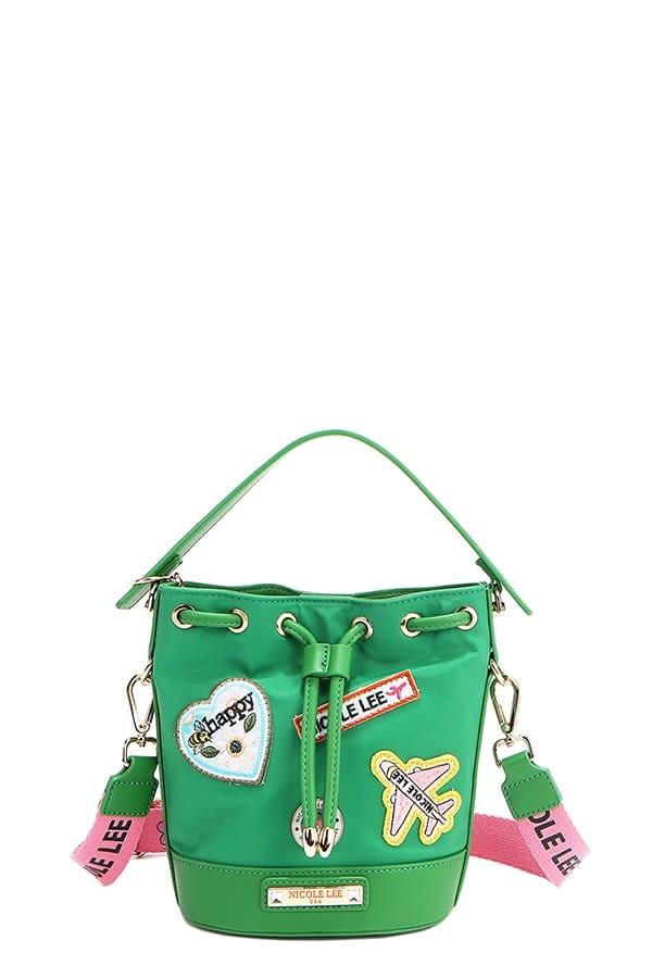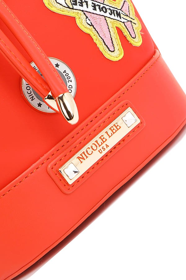 This vibrant red bucket-style crossbody bag features a fashion drawstring closure and eye-catching decorative patches including cartoon characters and colorful accents. Made from durable synthetic leather material with gold-tone hardware, it offers adjustable crossbody wear for hands-free convenience. The compact design is perfect for carrying daily essentials while making a bold fashion statement with its playful patch details and street-style aesthetic.
