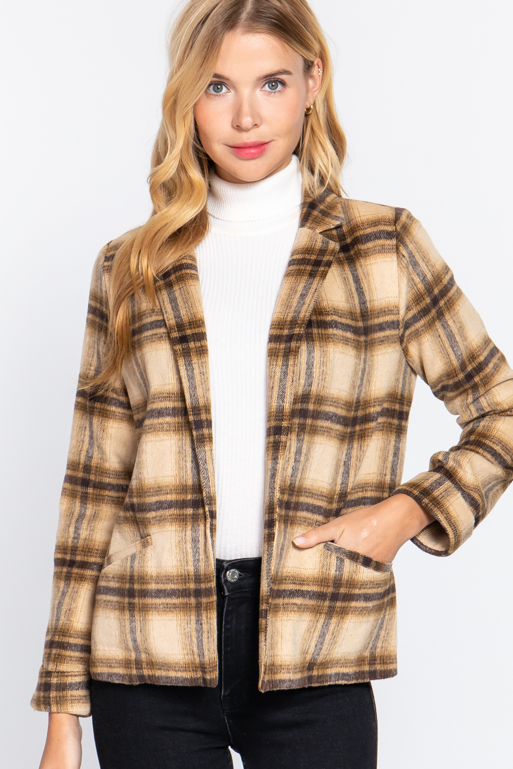 Choose Options HYFVE Plaid Collared Neck Boucle Jacket with Pockets MSRP: Was: Now: $48.95 Plaid Collared Neck Boucle Jacket with Pockets is a stylish and chic plaid jacket with a unique coll…