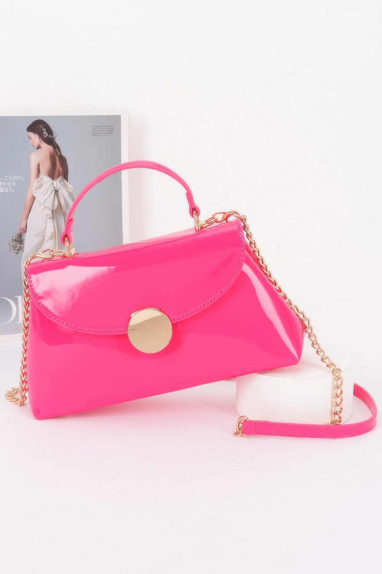 Elevate your ensemble with the Patent Faux Leather Top Handle Bag, a structured piece designed for polished impact. Featuring a glossy patent finish and a distinctive circular accent, this top handle bag commands attention. A detachable chain strap allows for crossbody versatility, making it easy to transition from daywear to evening sophistication. Its compact size is ideal for formal settings, while the bold design adds a modern edge to any refined outfit.