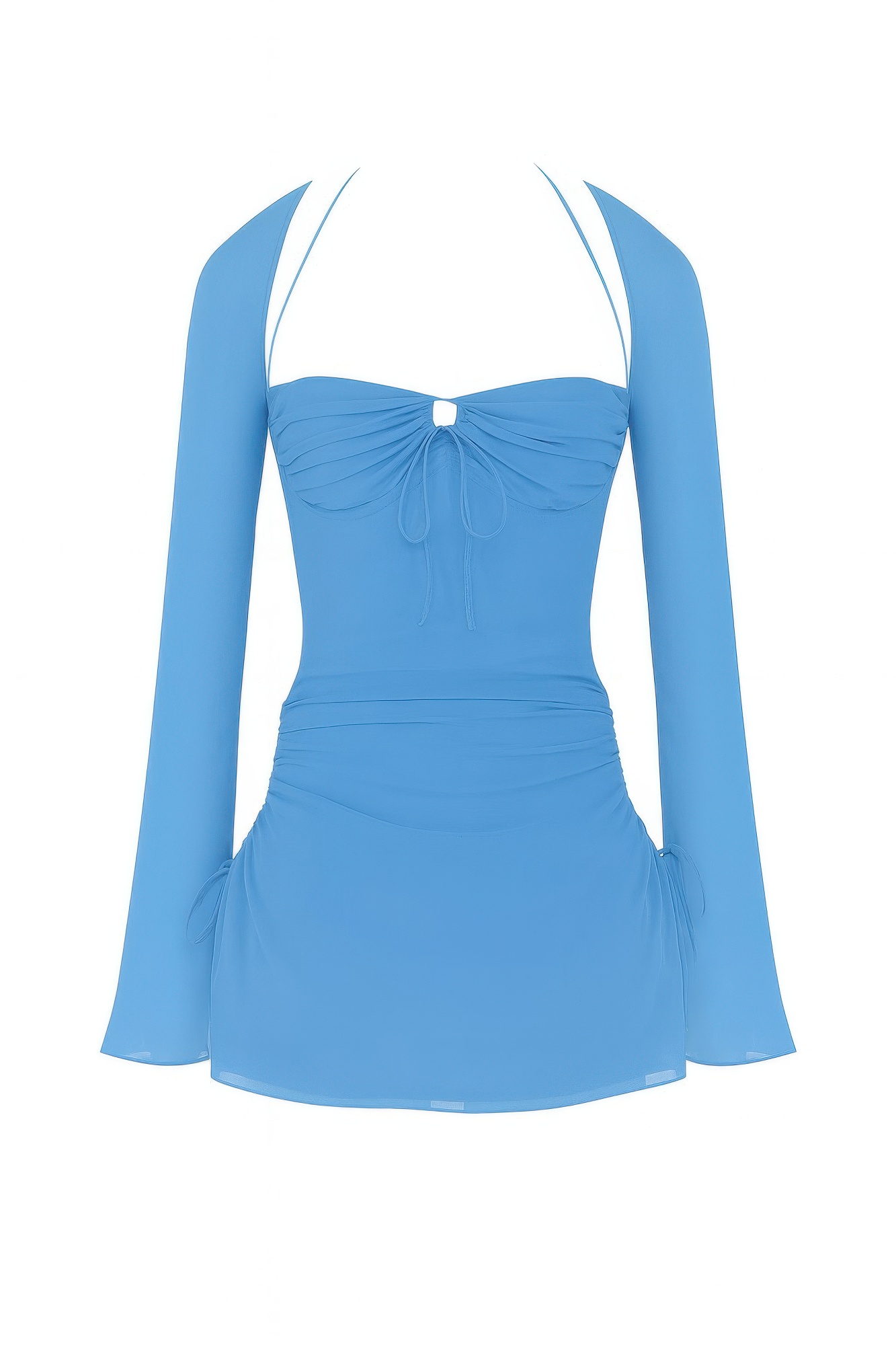 Daring yet sophisticated, this peek hole mini dress is the ultimate statement piece for your next night out. Crafted with a halter neckline and long sleeves featuring flared ends, it blends modern elegance with subtle sensuality. The side peek holes and slits add a bold touch, while the non-stretch fabric offers a structured, figure-flattering silhouette. Perfect for parties, date nights, or special occasions, this mini dress commands attention with every detail.