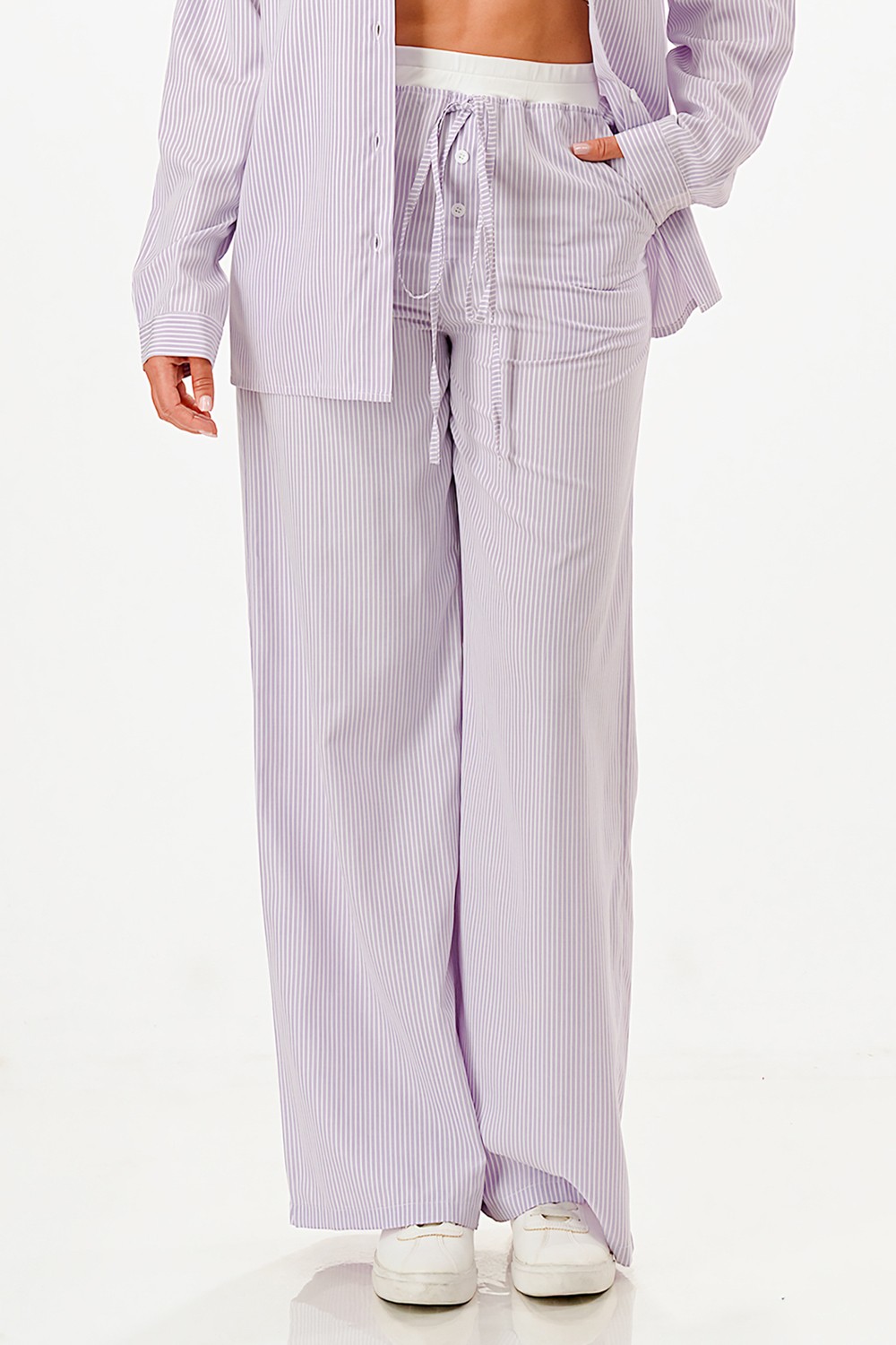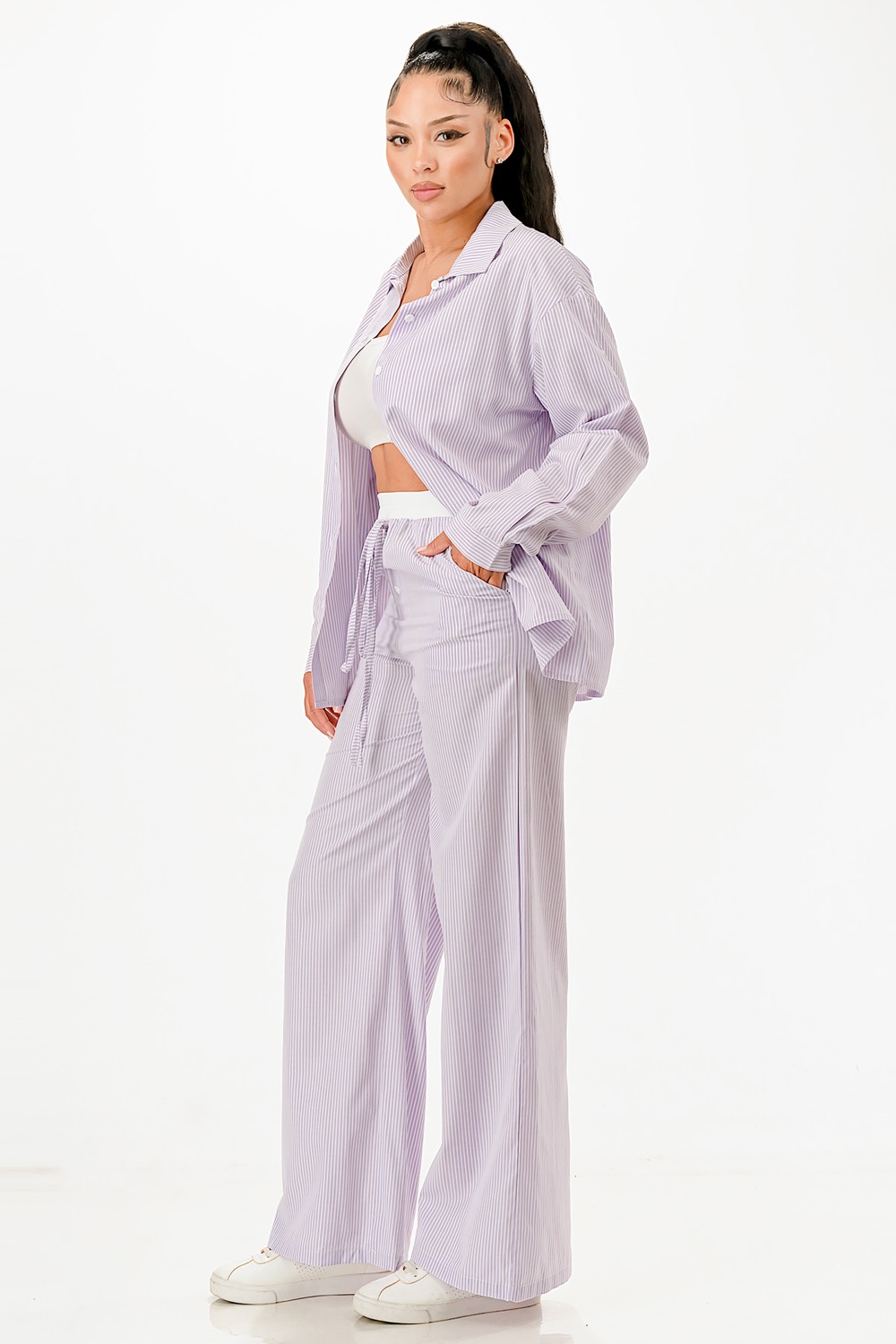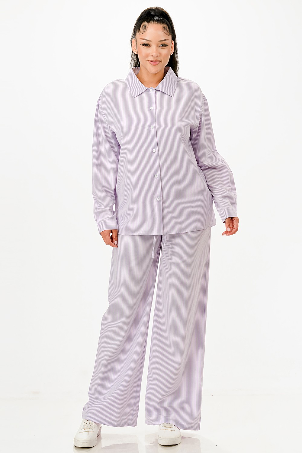 Relaxed yet refined, this pinstripe shirt and pant set brings effortless polish to your lounge and off-duty wardrobe. The oversized button-down shirt offers a breezy fit with classic tailoring, while the matching wide-leg pants flow with ease for all-day comfort. Crafted from a soft, stretch-enhanced fabric and detailed with subtle pinstripes, this set delivers laid-back sophistication in three versatile colors: black, blue, and lavender. Finished with functional pockets, it's a stylish go-to for lounging, travel, or casual wear.