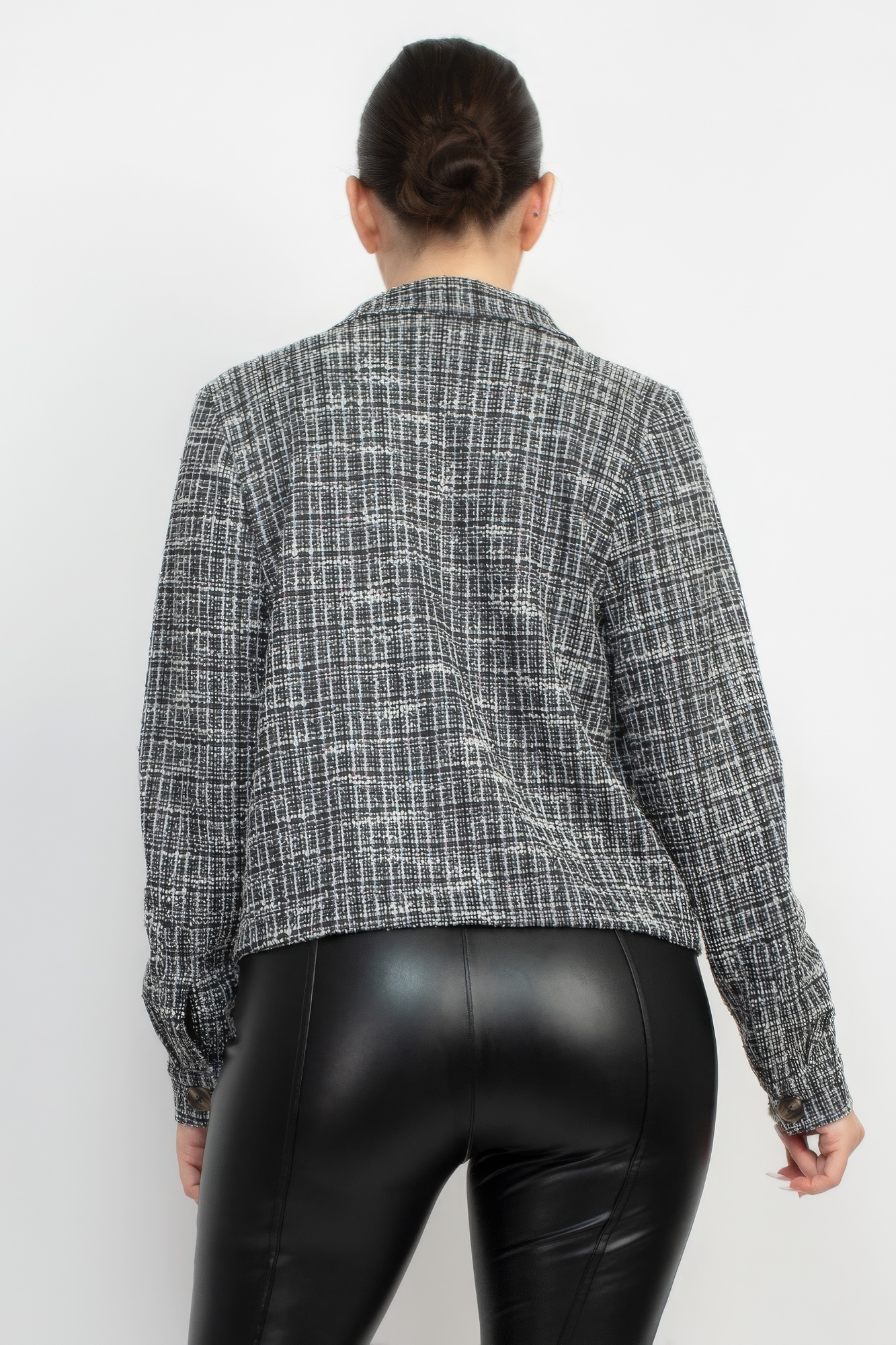 A knit tweed jacket in a plaid pattern featuring a collared neckline, button-down closure, chest pockets, long cuffed sleeves, and a waist length