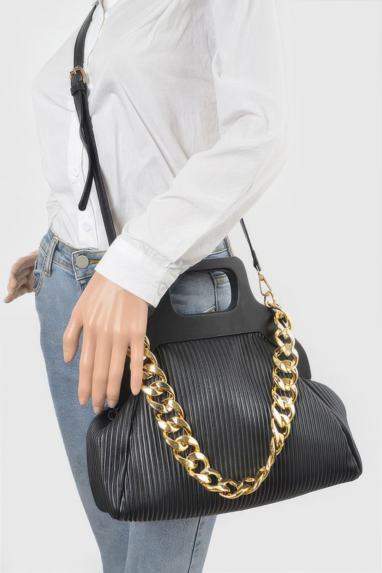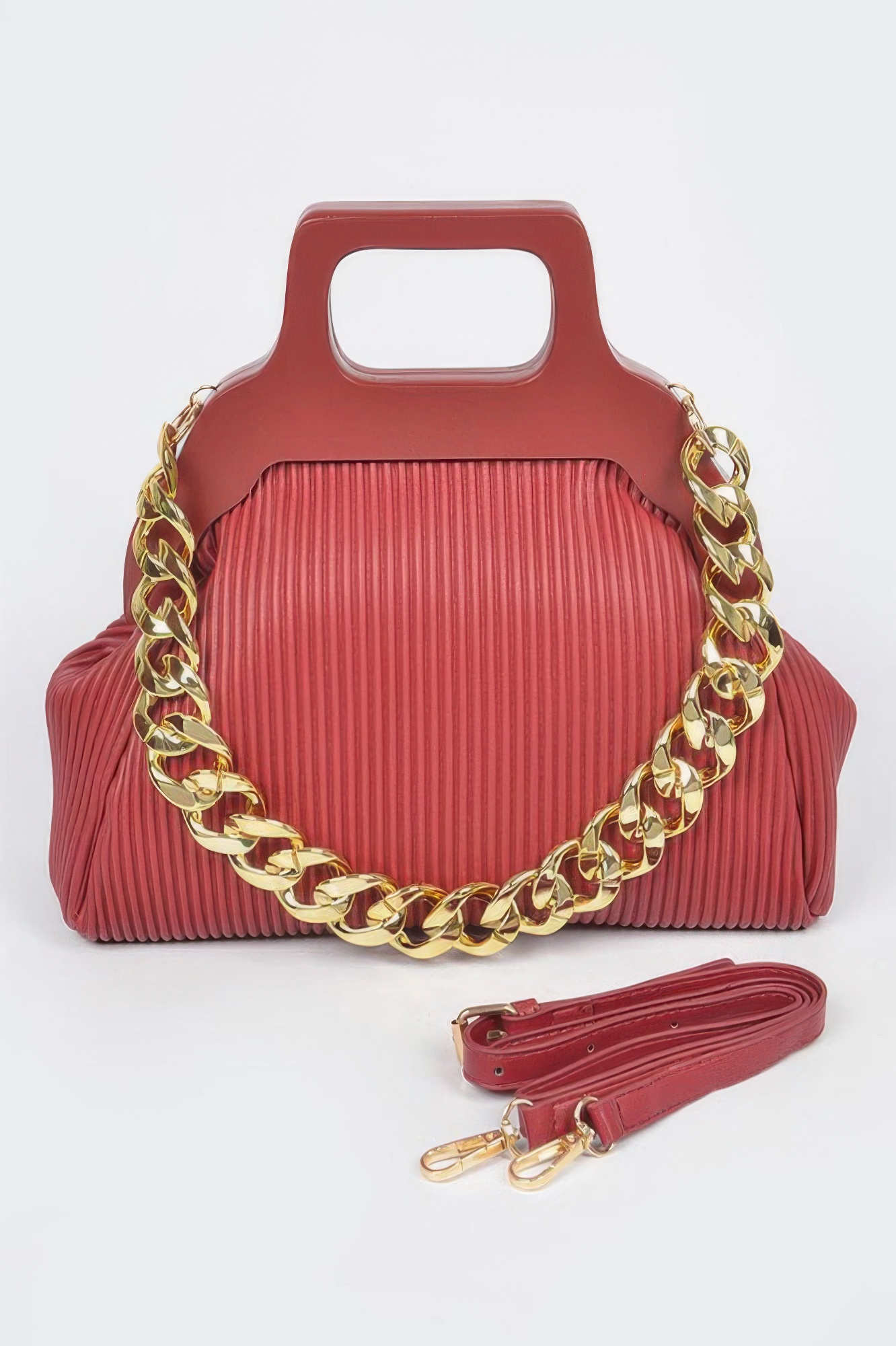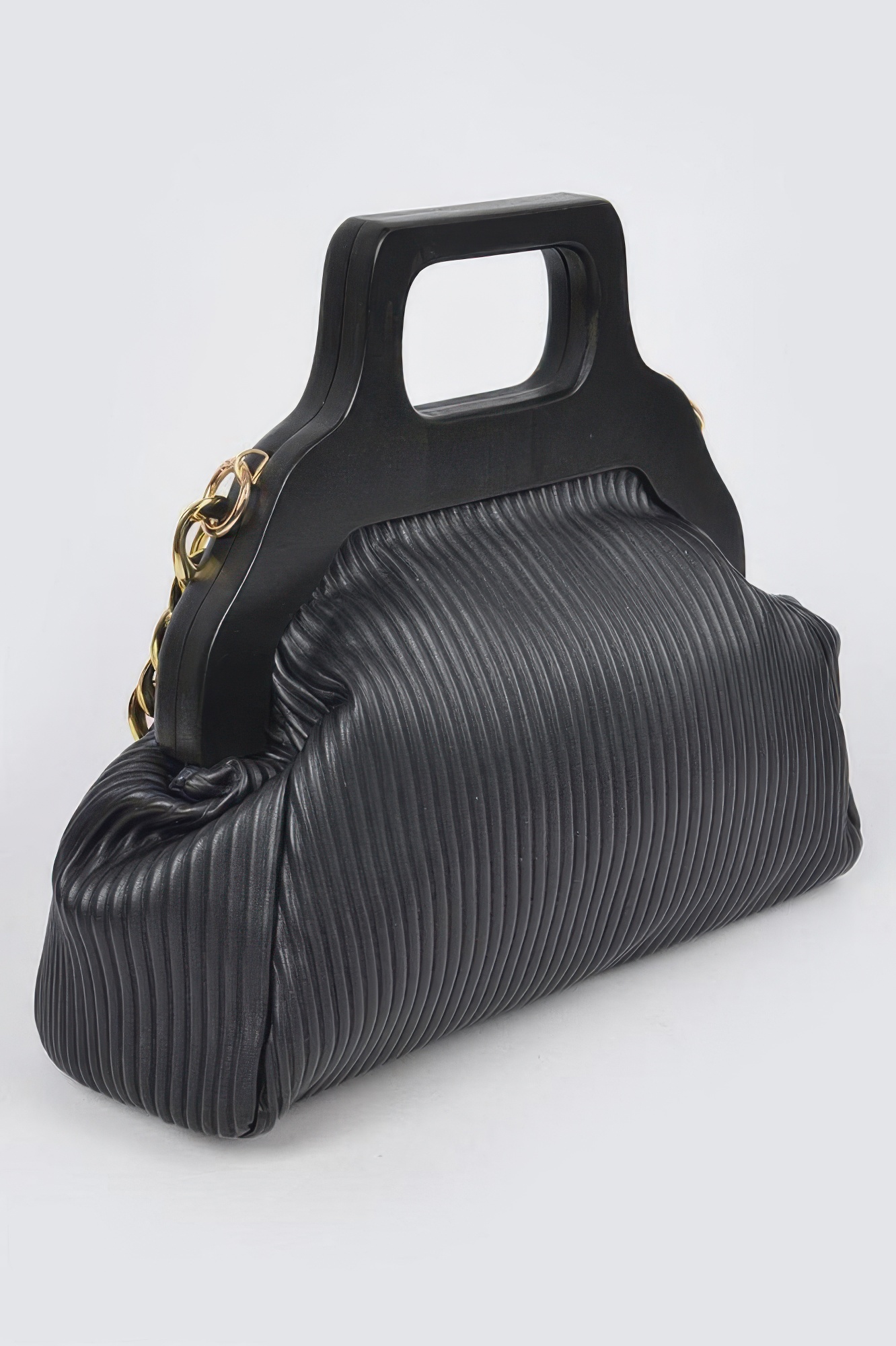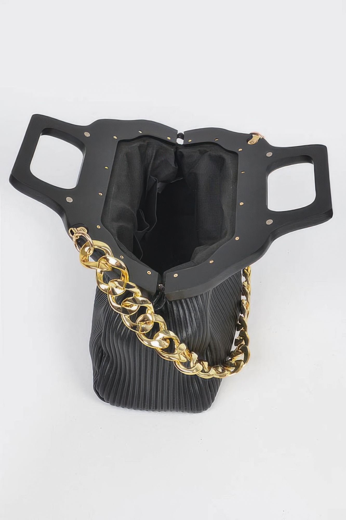 This pleated wooden handle chain bag offers a refined blend of structure and texture. The pleated design adds dimension, while the wooden handle introduces a natural-inspired element. Its spacious interior makes it suitable for carrying daily essentials with ease. The added chain strap provides versatility in styling and wear. A distinctive accessory, it elevates both casual and polished looks.