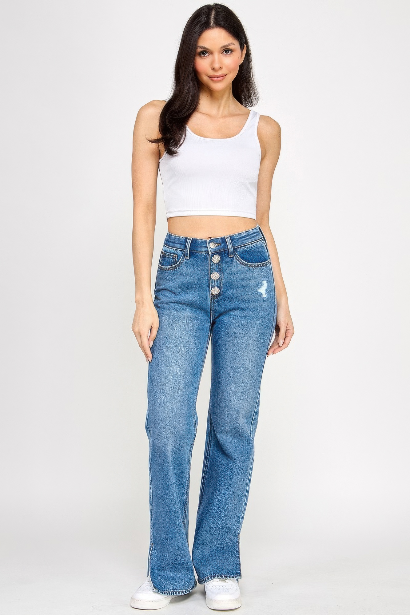 Make everyday denim feel special with these plus-size high-rise straight-leg jeans, accented with elegant jewel buttons for a touch of shine. The high-rise waist enhances your natural shape, while the straight-leg cut provides a balanced, flattering fit. Crafted from a durable cotton blend, these jeans offer structure with a comfortable feel. The jewel button detailing adds a polished finish, making them perfect for both casual wear and dressed-up moments. Pair with everything from basic tees to blouses for elevated, effortless style.
