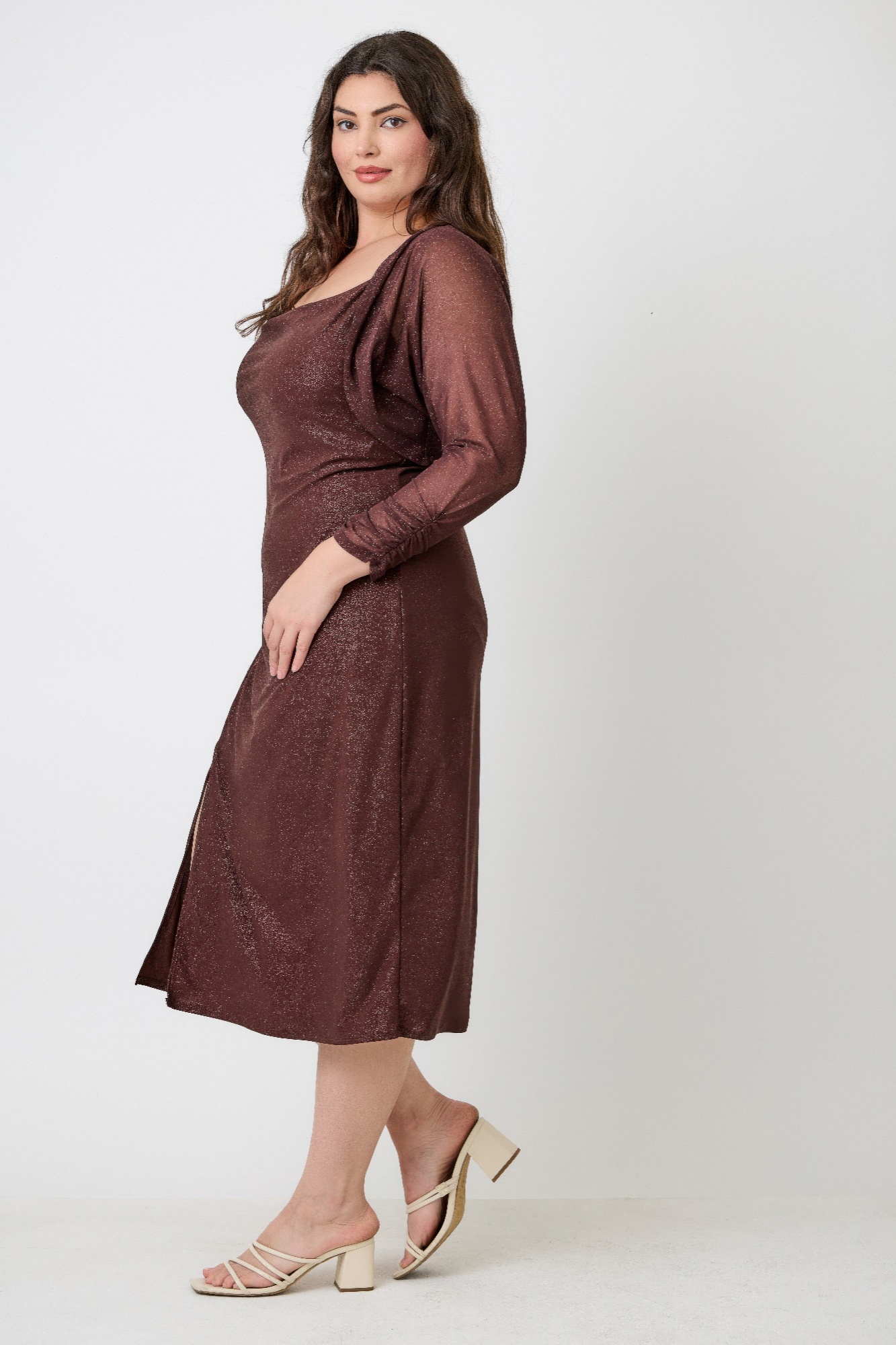 Shine with understated elegance in this plus size shimmer midi dress with a front slit. Featuring a graceful cowl neckline and sleeveless design, this dress flatters your figure with a smooth, flowing silhouette. The lightweight, subtly sparkling fabric catches the light beautifully, offering just the right amount of glamour for special occasions or evening events. Designed for comfort and sophistication, it drapes effortlessly and moves with ease. Perfect on its own or paired with delicate accessories, this dress delivers timeless appeal.