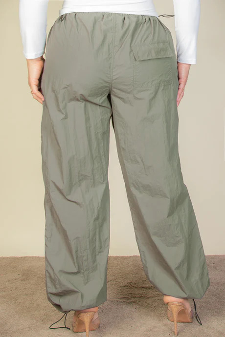 Experience comfort and versatility with our Plus Size Drawstring Waist Parachute Pants in olive green. Elevate your everyday style effortlessly!