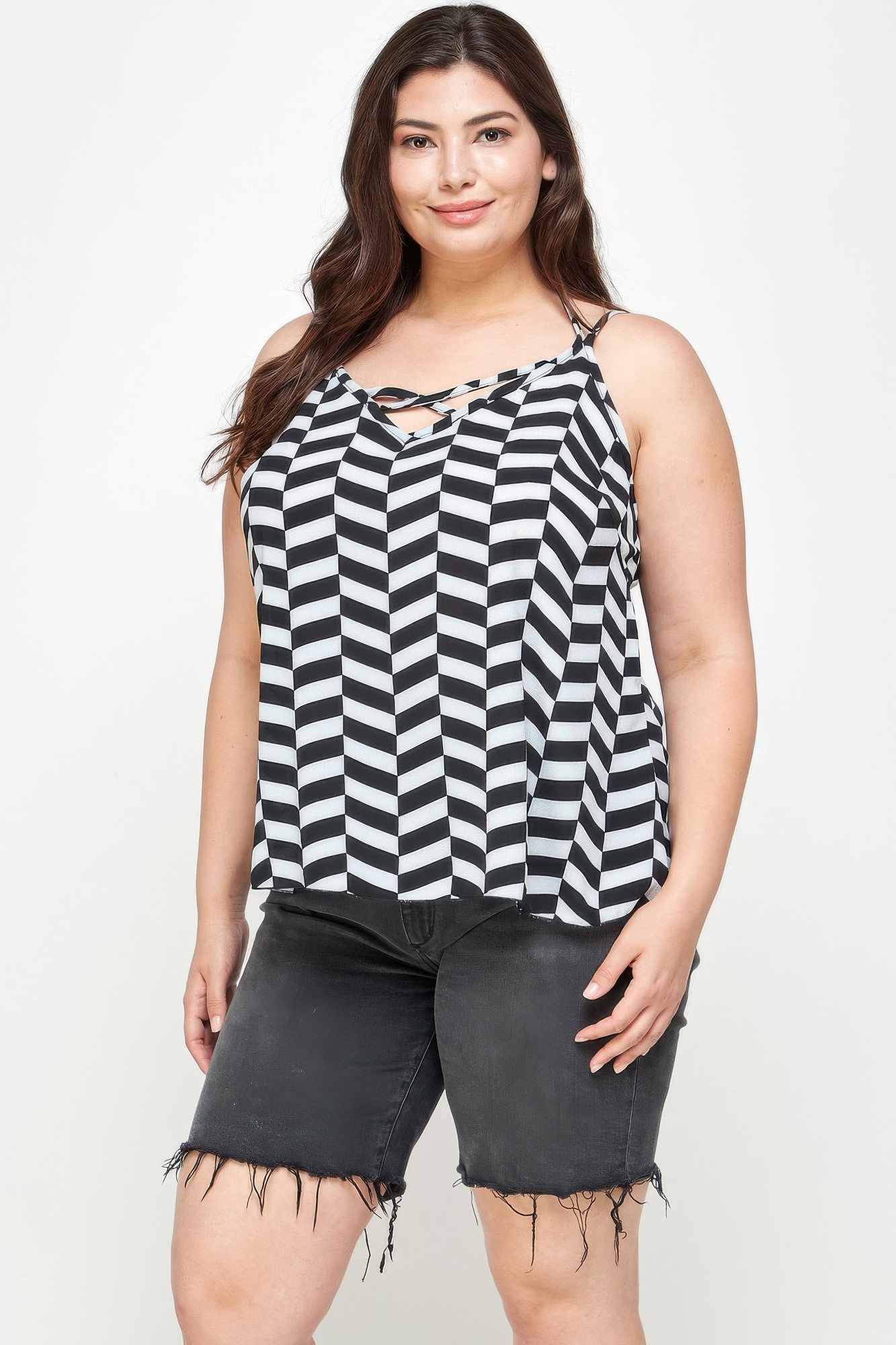 Brighten your warm-weather wardrobe with this Plus Size Geometric Top featuring double spaghetti straps and a flowing silhouette. Designed with a vibrant chevron pattern, it brings bold visual energy to casual summer styling. The sleeveless cut and lightweight fabric keep the look breathable and comfortable throughout the day. A softly draped neckline adds gentle dimension, balancing the structured geometric print. Effortlessly eye-catching and easy to pair, this top is perfect with denim, shorts, or relaxed trousers for a standout seasonal look.