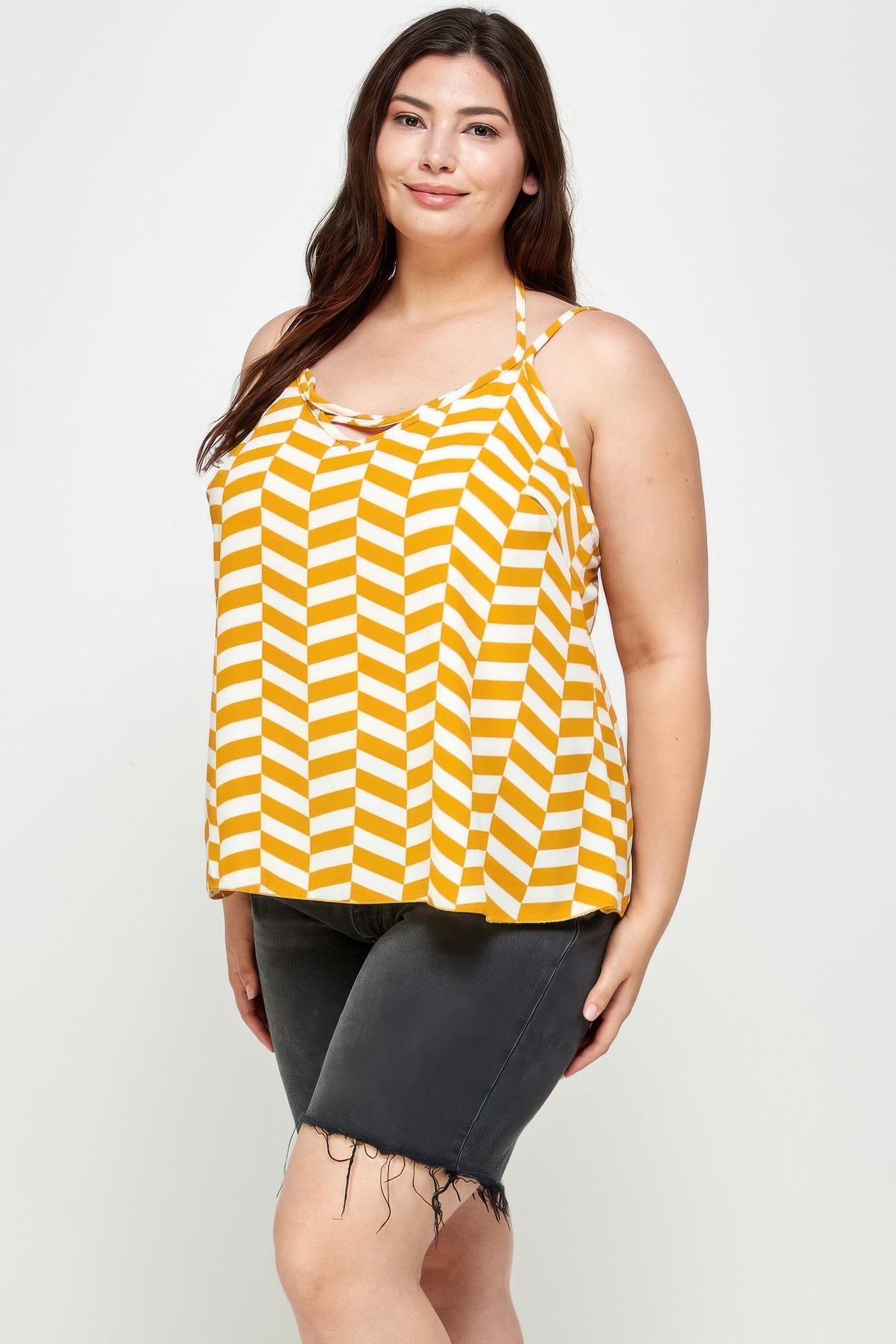 Brighten your warm-weather wardrobe with this Plus Size Geometric Top featuring double spaghetti straps and a flowing silhouette. Designed with a vibrant chevron pattern, it brings bold visual energy to casual summer styling. The sleeveless cut and lightweight fabric keep the look breathable and comfortable throughout the day. A softly draped neckline adds gentle dimension, balancing the structured geometric print. Effortlessly eye-catching and easy to pair, this top is perfect with denim, shorts, or relaxed trousers for a standout seasonal look.