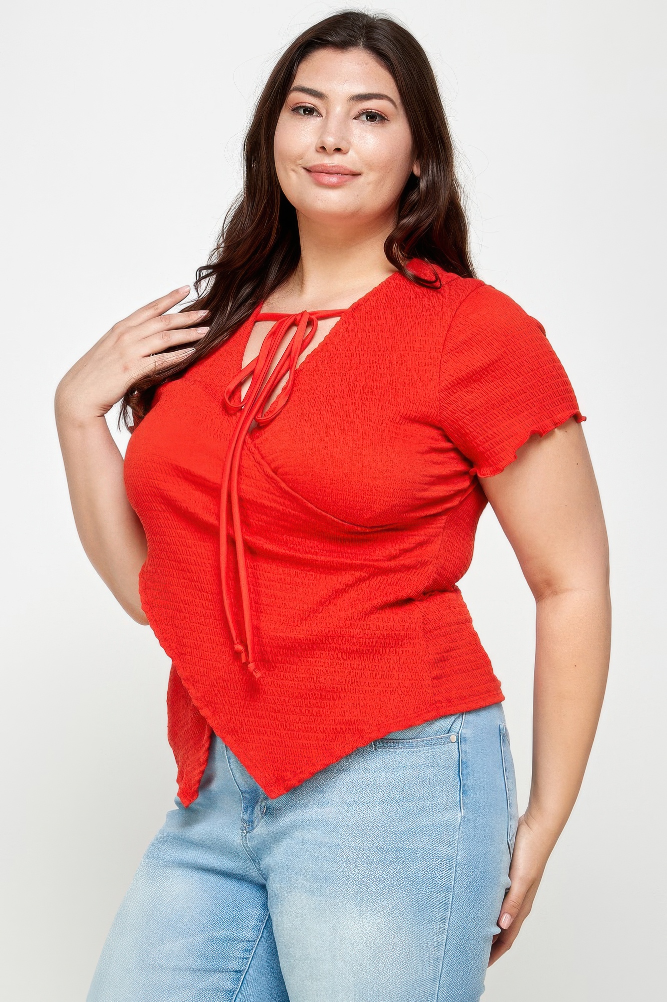Refine your everyday style with this Plus Size Textured Wrap Top With Tie Neck, designed to flatter with soft structure and feminine detail. The gently textured knit fabric adds dimension while maintaining lightweight comfort and stretch. A classic V-neckline is elevated by a delicate tie-neck accent, offering a polished finish. Short ruffle sleeves bring subtle movement, while the asymmetrical wrap hem enhances shape and provides comfortable coverage. Versatile and easy to style, this top transitions seamlessly from office settings to weekend outings.