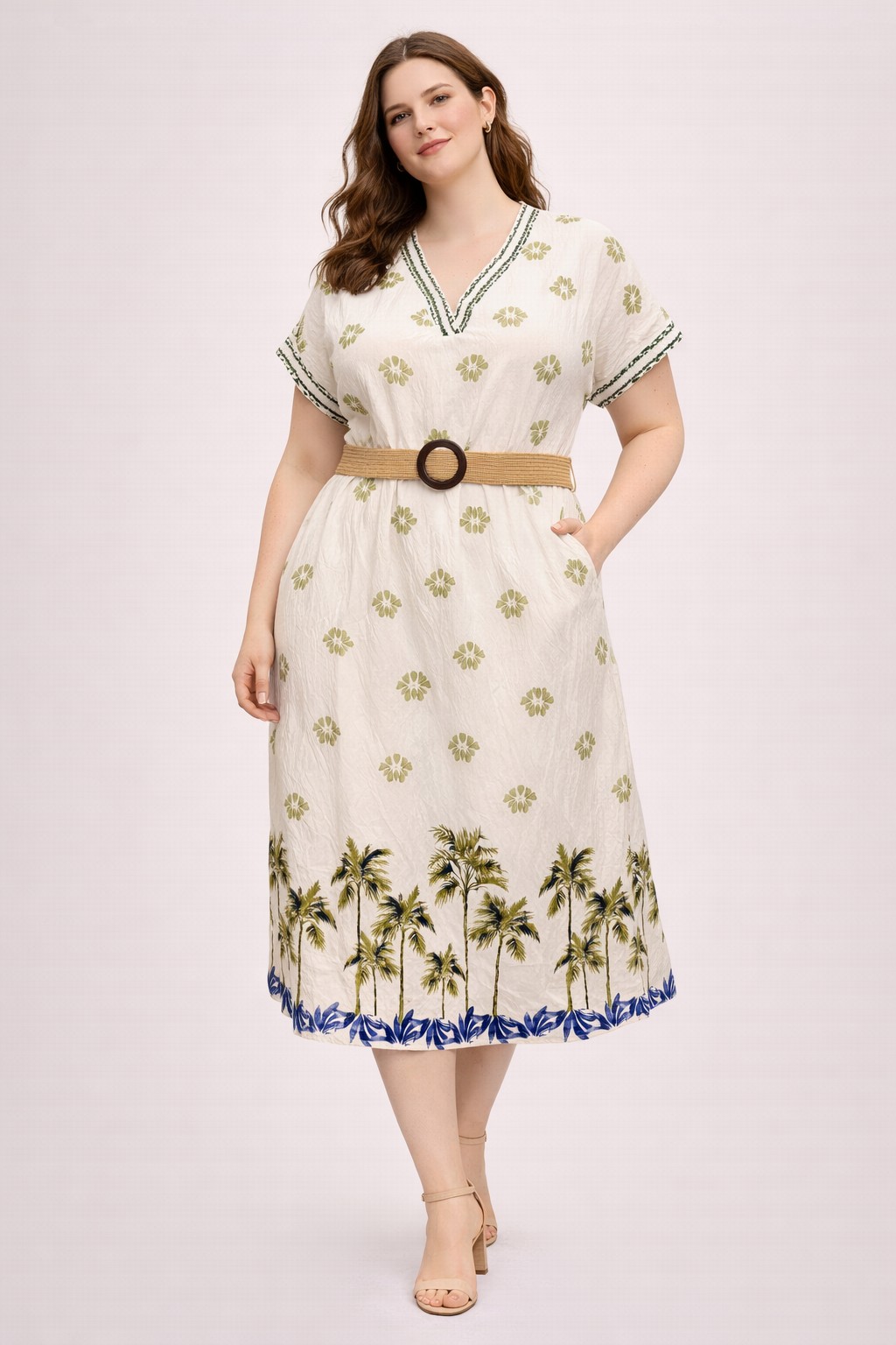 The Plus Size Tropical Border Print Midi Dress is designed to bring effortless vacation-inspired style to your wardrobe. Featuring a flattering V-neckline and relaxed short sleeves, it offers a breezy, comfortable silhouette that moves with ease. The soft neutral base is beautifully enhanced with scattered floral motifs and a bold palm tree border print at the hem, creating a chic island-ready aesthetic. A woven statement belt cinches the waist, adding definition and enhancing the overall shape. The flowy midi length provides an elegant, easygoing finish that suits a variety of occasions. Perfect for brunches, resort getaways, or casual summer days, this dress blends comfort with standout style.