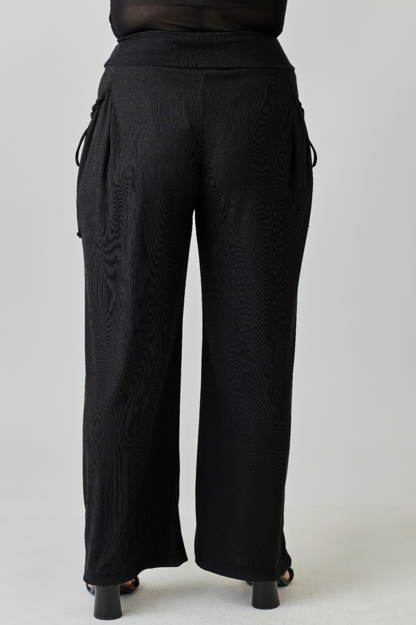 Step into effortless style with these plus size wide-leg pants featuring chic side drawstring details. Crafted with a smooth high waistband, these pants offer a flattering, comfortable fit that accentuates your shape. The adjustable drawstrings at the sides create subtle ruching at the hips, adding a touch of modern flair. With a relaxed wide-leg silhouette and lightweight, flowy fabric, they deliver all-day comfort and easy movement. Perfect for both casual days and dressier occasions, these pants bring versatility and sophistication to any look.