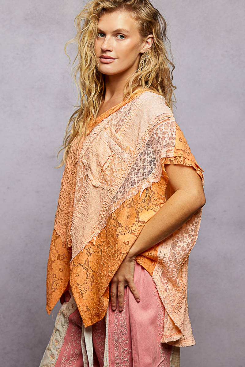POL Asymmetrical V-Neck Short Sleeve Lace Top