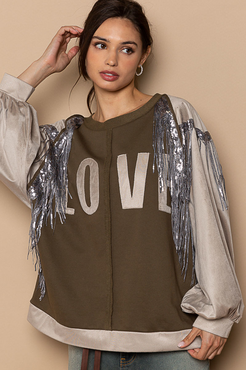 This stylish oversized sweatshirt features a premium cotton blend construction for ultimate comfort and durability. The eye-catching olive green base showcases a bold LOVE graphic print while contrasting beige balloon sleeves add visual interest. Stunning sequin fringe detailing along the sleeves creates movement and glamour, making this piece perfect for casual outings or statement streetwear looks. The relaxed oversized fit provides comfort while maintaining a fashion silhouette. Ideal for layering and perfect for those who want to make a fashion statement with comfortable everyday wear.